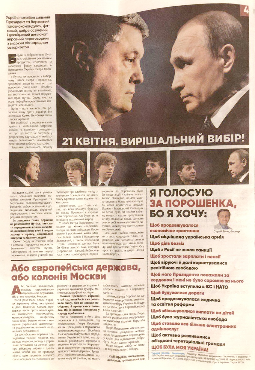 У номері від 4-11 квітня газета «КП в Украине» надрукувала низку матеріалів, в яких автори та залучені експерти в позитивному світлі коментують передвиборчу кампанію Зеленського. Водночас гострої критики зазнає виборча активність чинного Президента. «КП в Украине» також запропонувала висловитись представнику штабу Зеленського, екс-міністру фінансів Олександру Данилюку. Позицію іншої сторони автори представили невеличкою цитатою самого Порошенка, яку в наступному ж абзаці критикує політолог Петро Олещук.