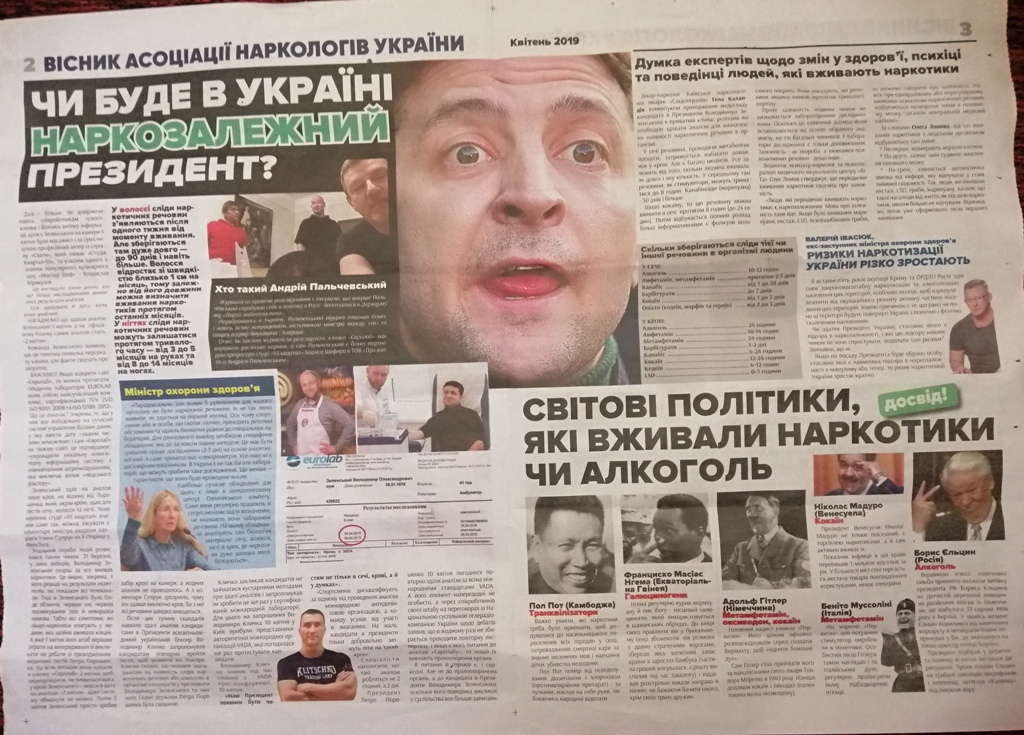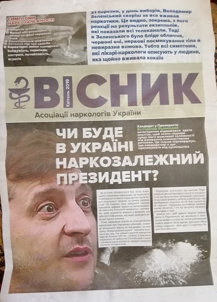 Газета «Вісник асоціації наркологів України» складається з чотирьох сторінок, на яких розповідається про те, що Володимир Зеленський, начебто, має наркотичну залежність. При цьому, в головній статті «Чи буде в Україні наркозалежний Президент?» наведені цитати Міністра охорони здоров’я Уляни Супрун, а також боксера Володимира Кличка, в яких вони розповідають про те, як виявити наявність психотропних речовин в організмі людини.