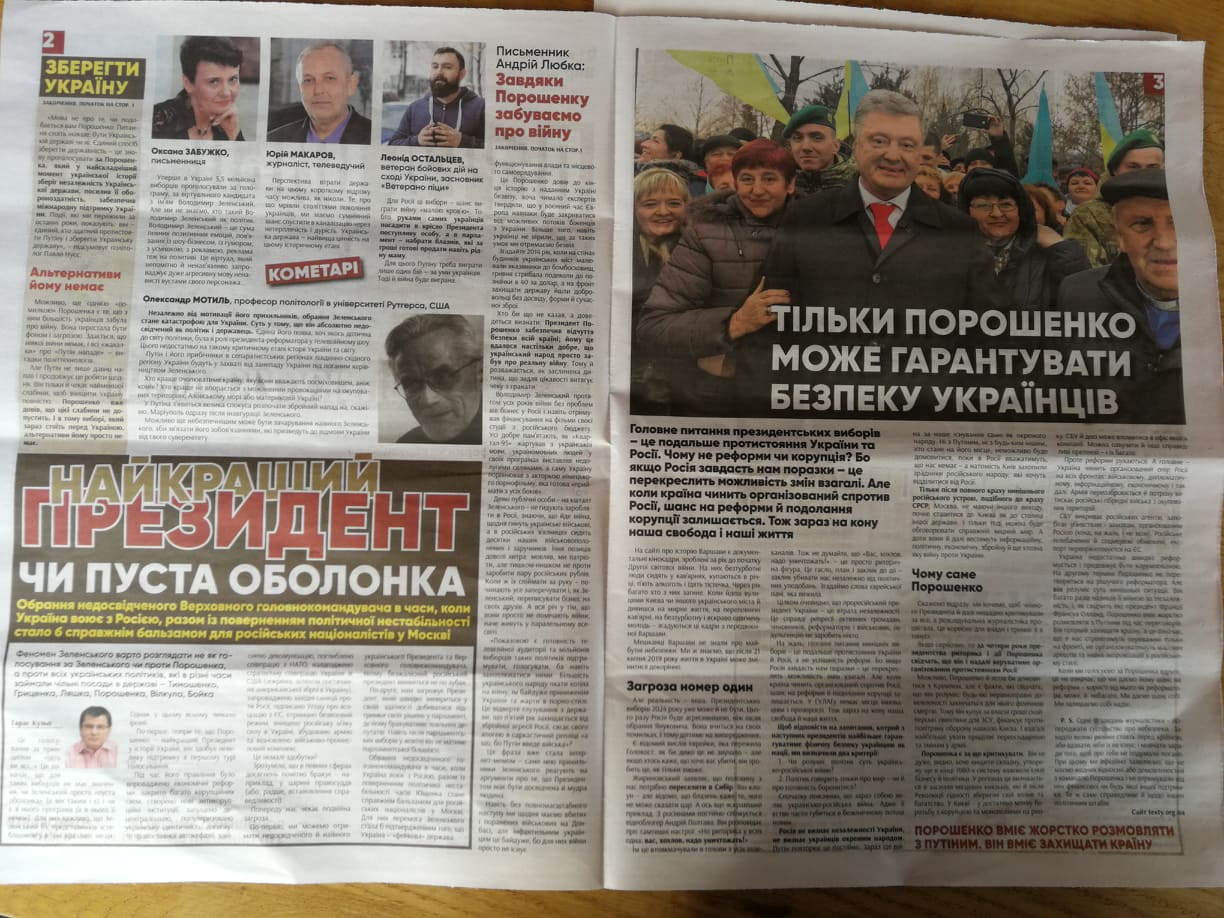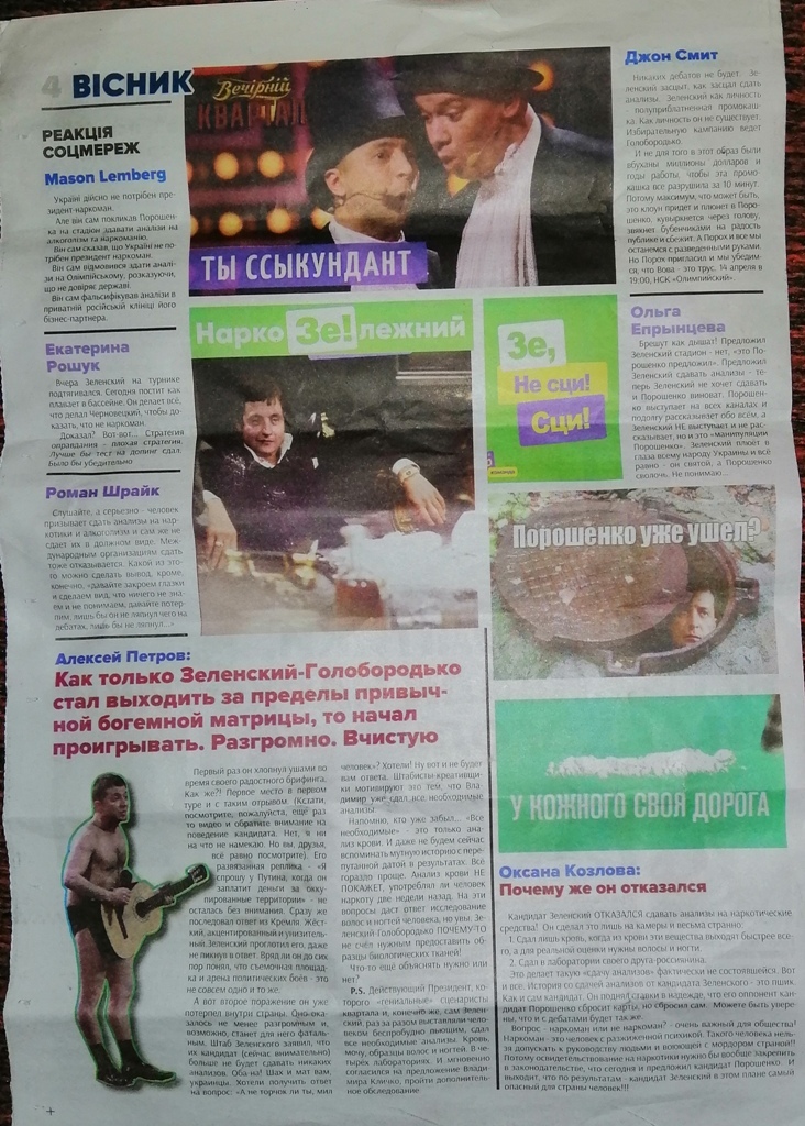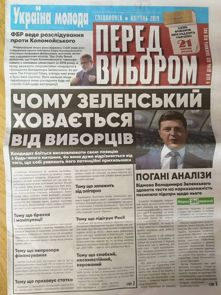 У Полтаві зафіксований черговий факт розповсюдження серед населення газет з можливими елементами «очорнення» кандидата в Президенти Володимира Зеленського. 17 квітня газета під назвою «Вісник асоціації наркологів України», розповсюджувалась по поштових скриньках мешканців Полтави. 18 квітня агітаторами «Команди Порошенка» роздавався серед населення спецвипуск газети «Україна молода».