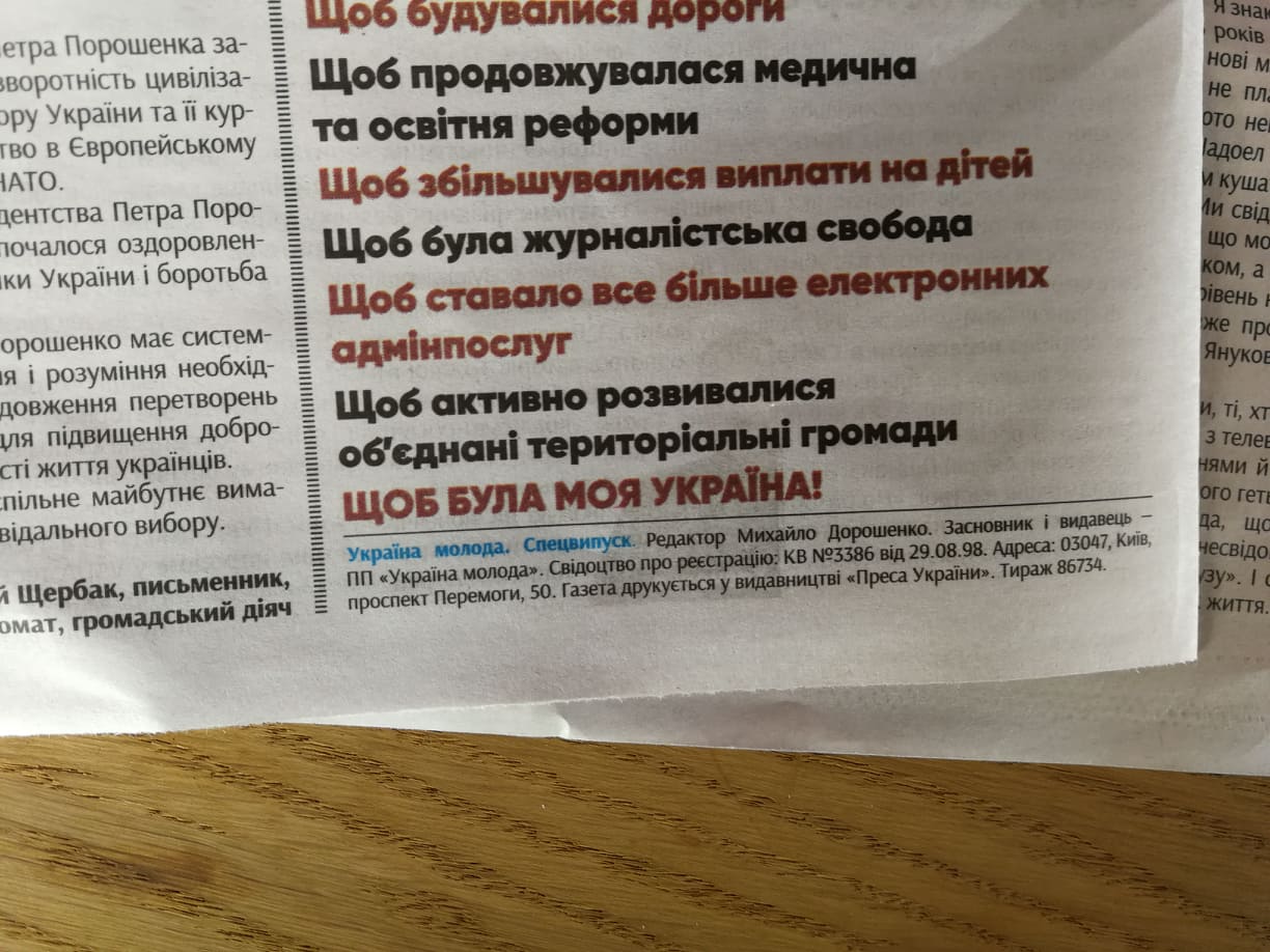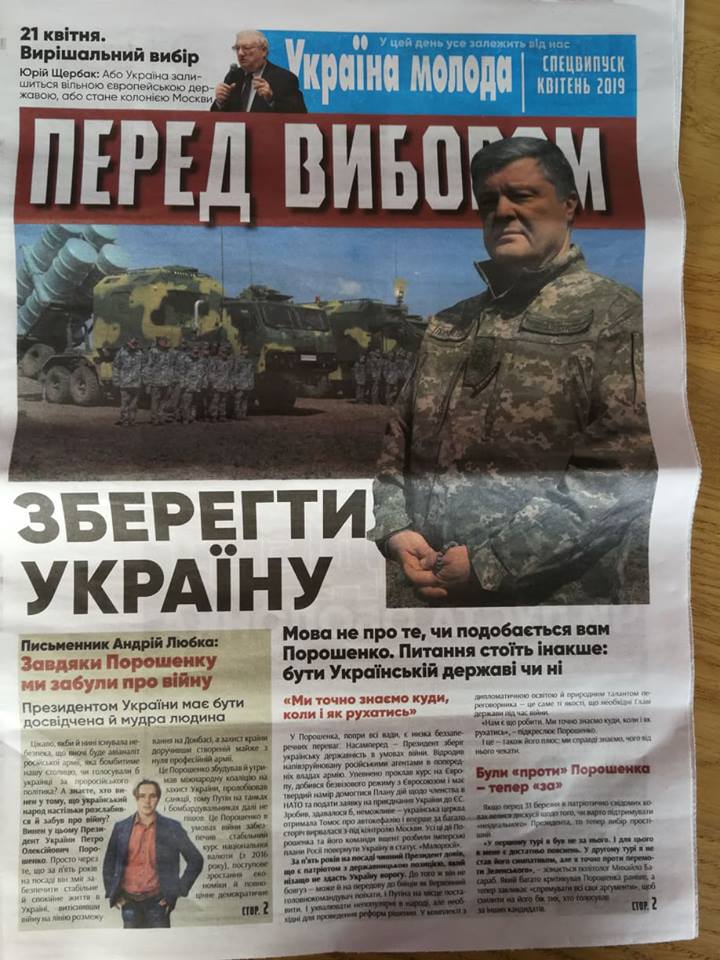 Також, 18 квітня в Полтаві спостерігачі ОПОРИ зафіксували факт розповсюдження серед населення агітаторами «Команди Порошенка» спецвипуску газети «Україна молода», який вийшов під назвою «Перед вибором». Спецвипуск має дві окремі газети по чотири сторінки. В одній з газет на обкладинці розміщено зображення Петра Порошенка та міститься заголовок «Зберегти Україну». Окрім цього, там розміщені матеріали під заголовками «Тільки Порошенко може гарантувати безпеку українцям», «Я голосую за Порошенка», в котрих створюється позитивний образ чинного Президента України.