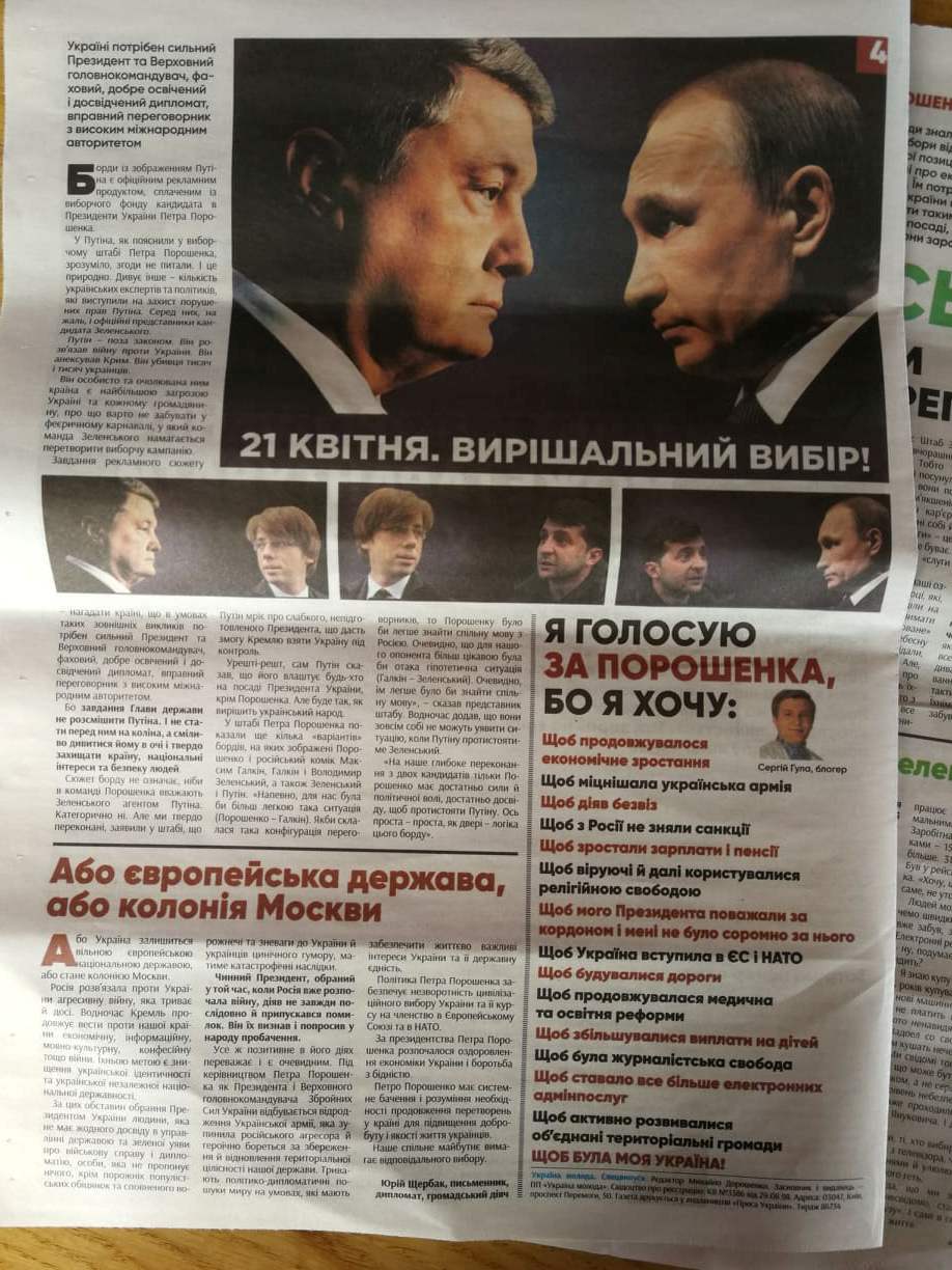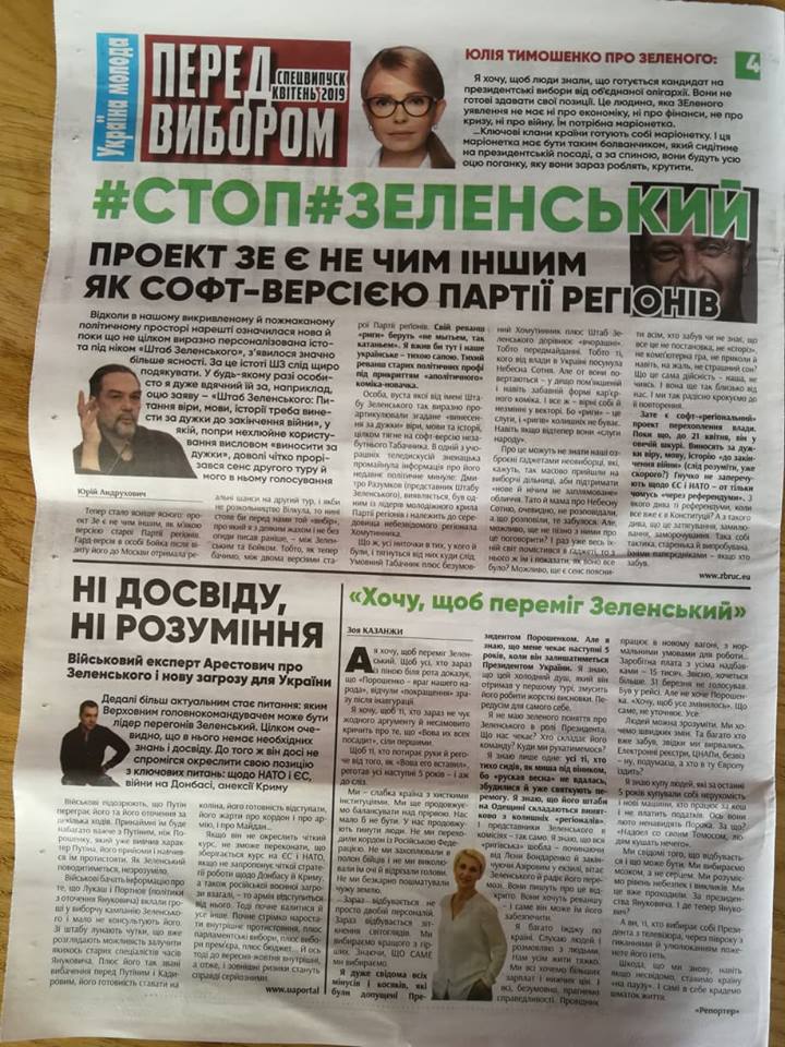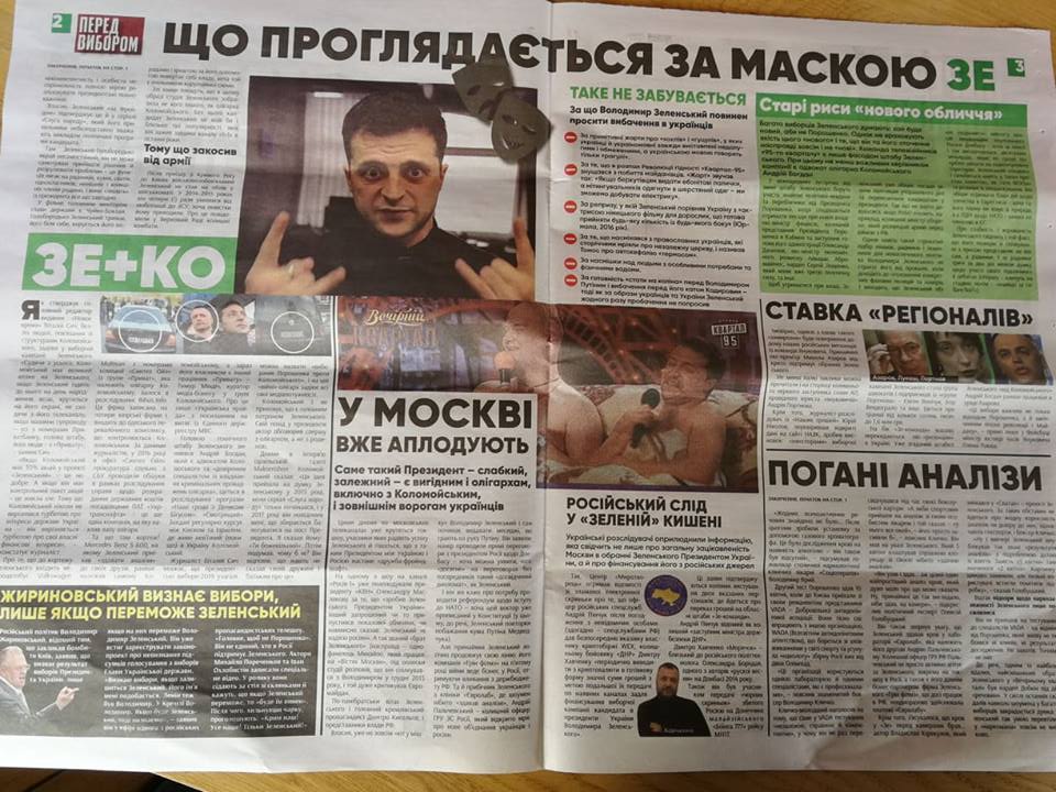 Інша газета спецвипуску йде під заголовком «Чому Зеленський ховається від виборців», в якому розміщені матеріали з можливими ознаками «очорнення» репутації Володимира Зеленського.