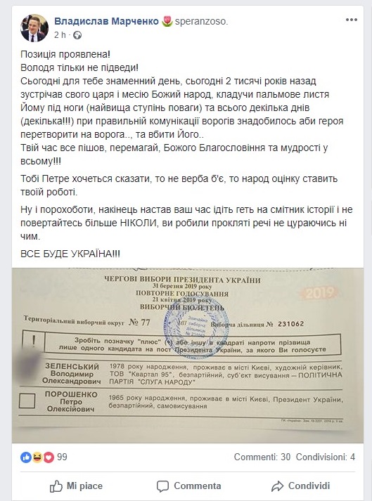 До Громадянської мережі ОПОРА звернулися громадяни із проханням відреагувати на допис у фейсбук заступника голови Запорізької обласної ради Владислава Марченка. Згаданий чиновник опублікував світлину виборчого бюлетеня і супроводив її текстом, що починається рядками: «Позиція проявлена! Володя тільки не підведи!». Також публікація містить фрази: «Тобі Петре хочеться сказати, то не верба б'є, то народ оцінку ставить твоїй роботі. Ну і порохоботи, накінець настав ваш час ідіть геть на смітник історії і не повертайтесь більше НІКОЛИ, ви робили прокляті речі не цураючись ні чим».