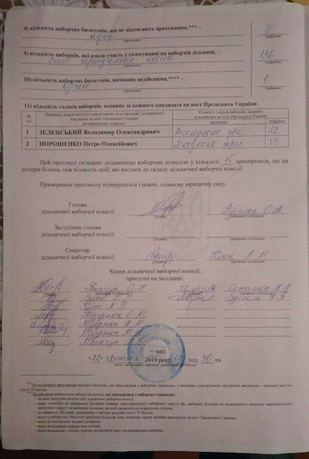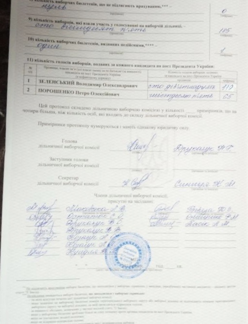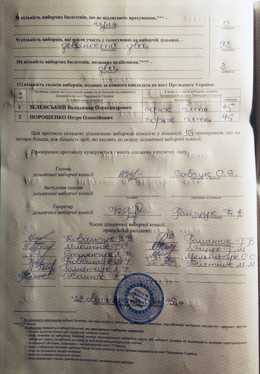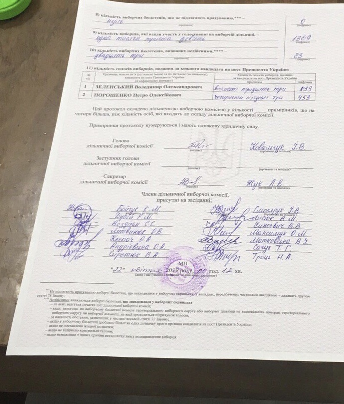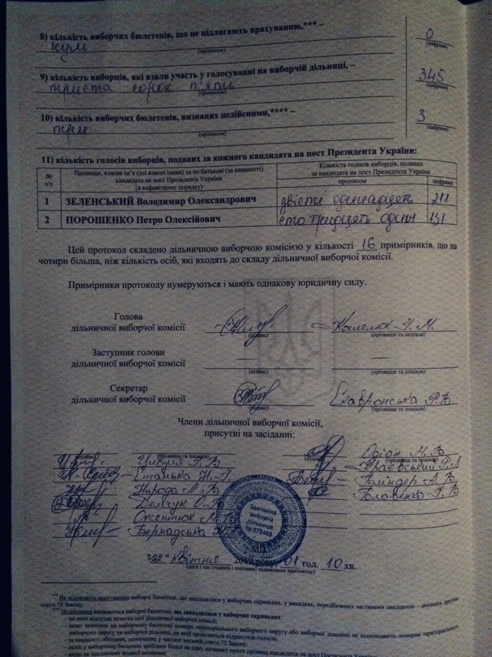 Відповідно до частини 4 статті 79 Закону України «Про вибори Президента України» у протоколі про підрахунок голосів виборців на виборчій дільниці зазначаються дата і час (година і хвилини) його підписання членами дільничної виборчої комісії. Кожен примірник протоколу підписується головою, заступником голови, секретарем та іншими членами дільничної виборчої комісії, які присутні на засіданні виборчої комісії. Цей протокол підписується членами дільничної виборчої комісії та засвідчується печаткою дільничної виборчої комісії лише після його остаточного заповнення.