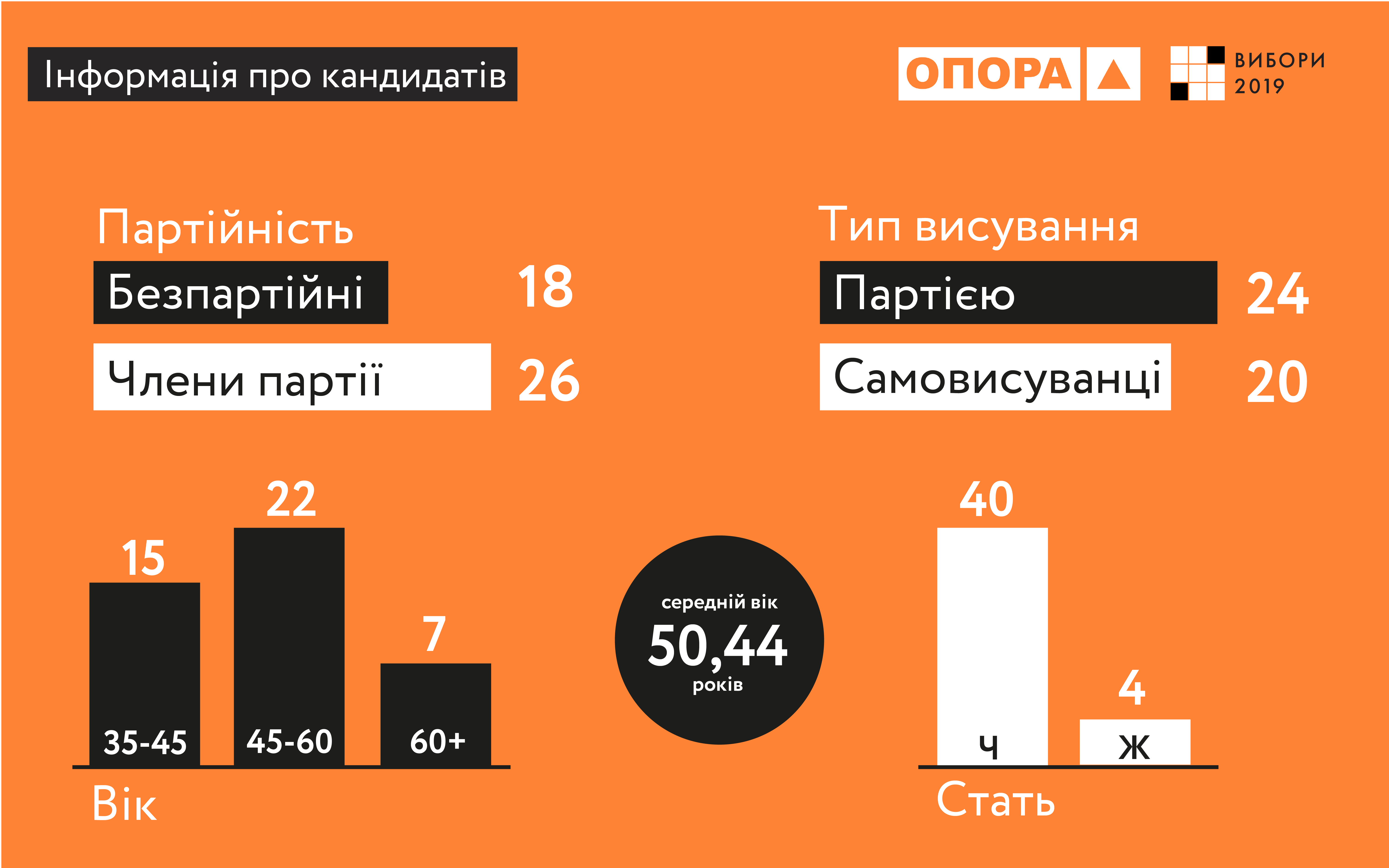 Середній вік кандидатів складає 50 років.  У віковій категорії 35-45 років зареєстровано 15 кандидатів, 45-60 років – 22 кандидати, більше 60 – 7.