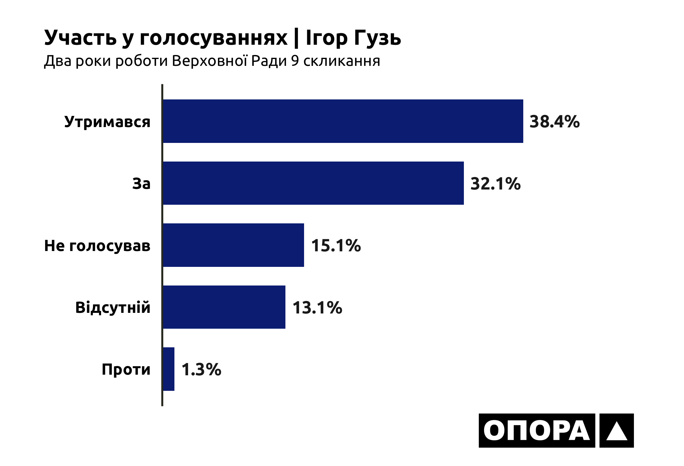Зокрема, народний депутат Ігор Гузь голосував «За» у 3 тис. 76 випадках (під час 32,1% голосувань), «Проти» – у 127 випадках (1,3%), «Утримався» – у 3 тис. 677 випадках (38,4%), «Не голосував» – у 1 тис. 446 випадках (15,1%), а також під час 1 тис. 256 голосувань (13,1%) був відсутній.