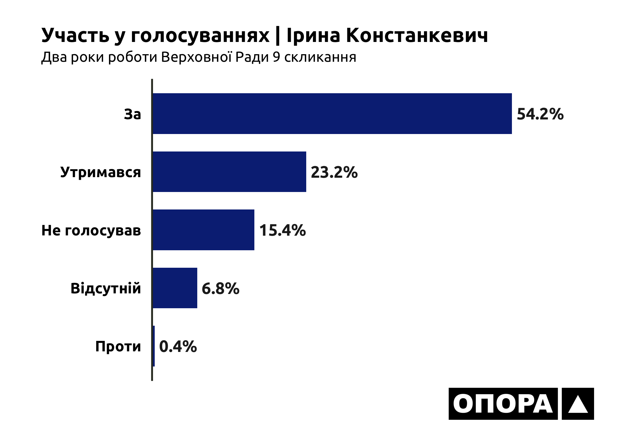 Найчастіше серед волинських парламентарів натискала кнопку «За» народна депутатка Ірина Констанкевич – у 5 тис. 194 випадках (54,2%). Також представниця Волині у Раді має на своєму рахунку 38 голосувань (0,4%) «Проти». «Утрималася» представниця округу №23 під час 2 тис. 221 голосування (23,2%). Позицію «Не голосувати» нардепка обирала 1 тис. 475 разів (15,4%). Ще під час 654 голосувань (6,8%) була відсутня.