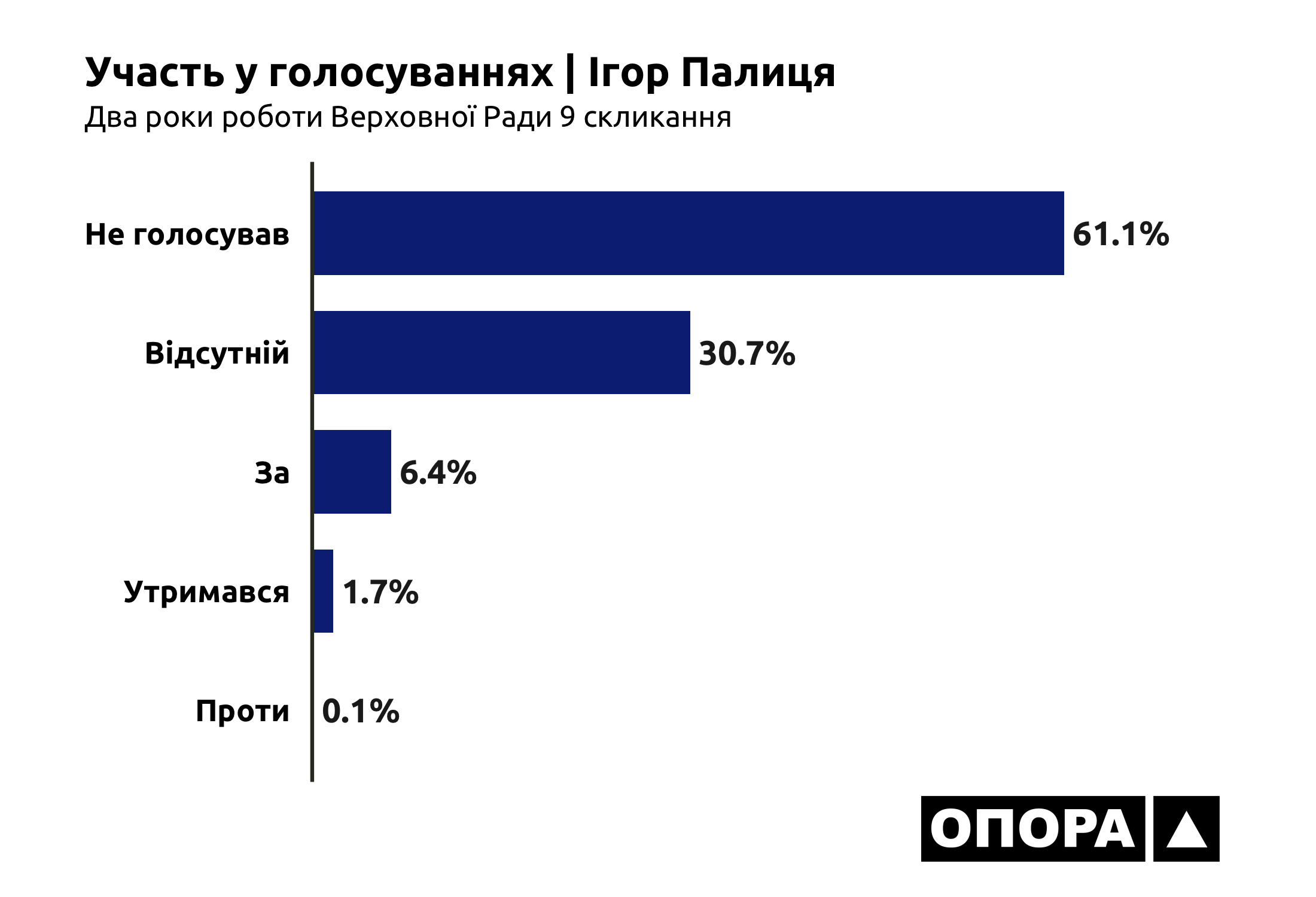 Народний депутат Ігор Палиця під час 610 голосувань (6,4%) обирав позицію «За», під час 9 голосувань (0,1%) – «Проти», у 163 випадках (1,7%) – «Утримався». Також нардеп «Не голосував» у 5 тис. 855 випадках (61,1%). Ще під час 2 тис. 945 голосувань (30,7%) був відсутній.