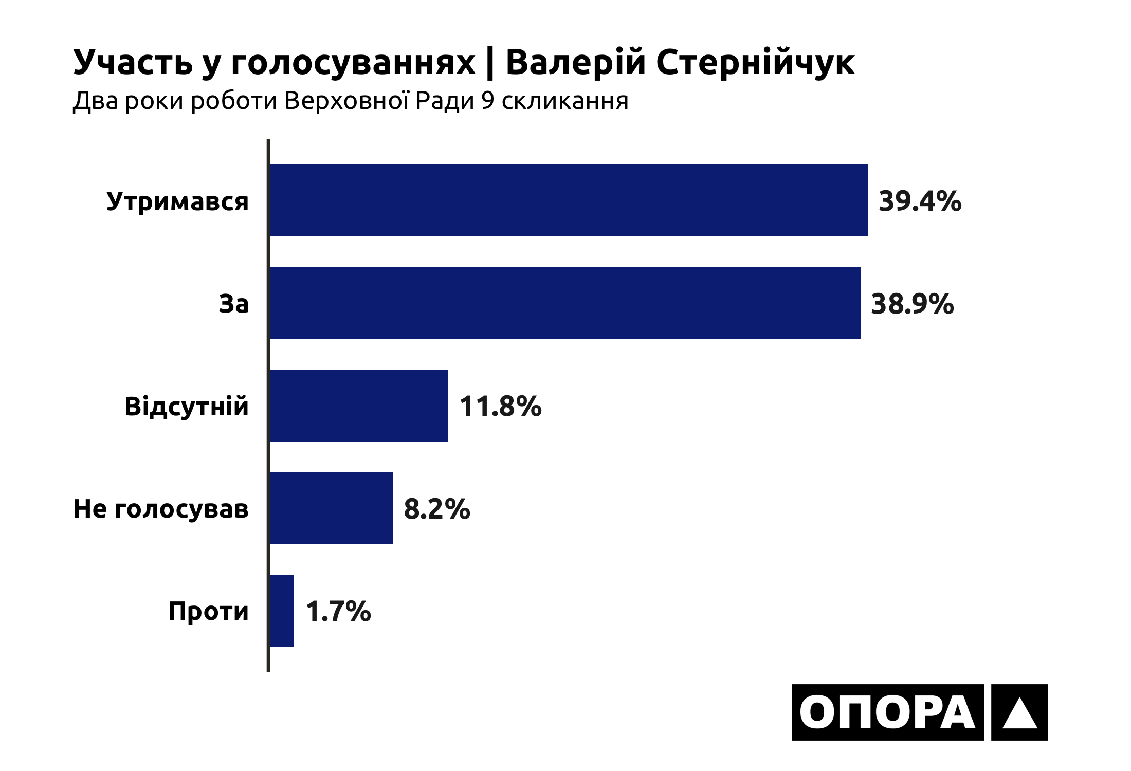 Щодо єдиного депутата-«списочника» з Волині Валерія Стернійчука, то на його рахунку протягом двох років депутатства 3 тис. 732 голосування (38,9%) «За», 158 голосувань (1,7%) «Проти», 3 тис. 775 голосувань (39,4%), під час яких нардеп «Утримався», 786 (8,2%) – під час яких він «Не голосував», та 1 тис. 131 голосування (11,8%), під час яких був відсутній.