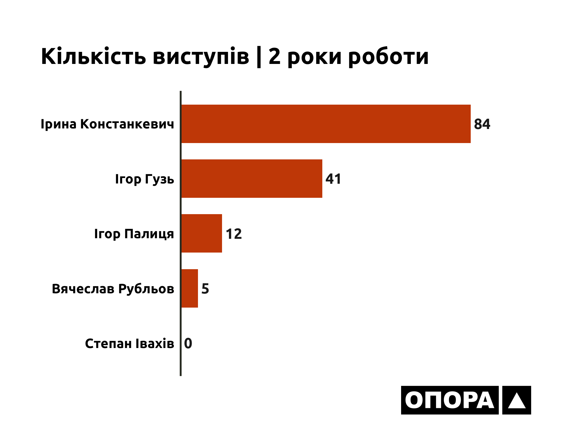 Найчастіше з-поміж волинських парламентарів виступала Ірина Констанкевич. На її рахунку налічується 84 виступи загальною тривалістю 1 година 39 хвилин 3 секунди. Народна депутатка частіше виступала з місця – 60 разів. Ще 24 її виступи лунали з трибуни. Народна депутатка виступала під час обговорення законопроєктів та проєктів постанов, озвучувала свої запитання міністрам під час години запитань до уряду, озвучувала оголошення, заяви та пропозиції, виступала під час оголошення звіту Кабінету Міністрів України, звіту про діяльність Державного бюро розслідувань та під час розгляду питань про призначення Міністром освіти і науки України Сергія Шкарлета і Міністром внутрішніх справ України Дениса Монастирського.