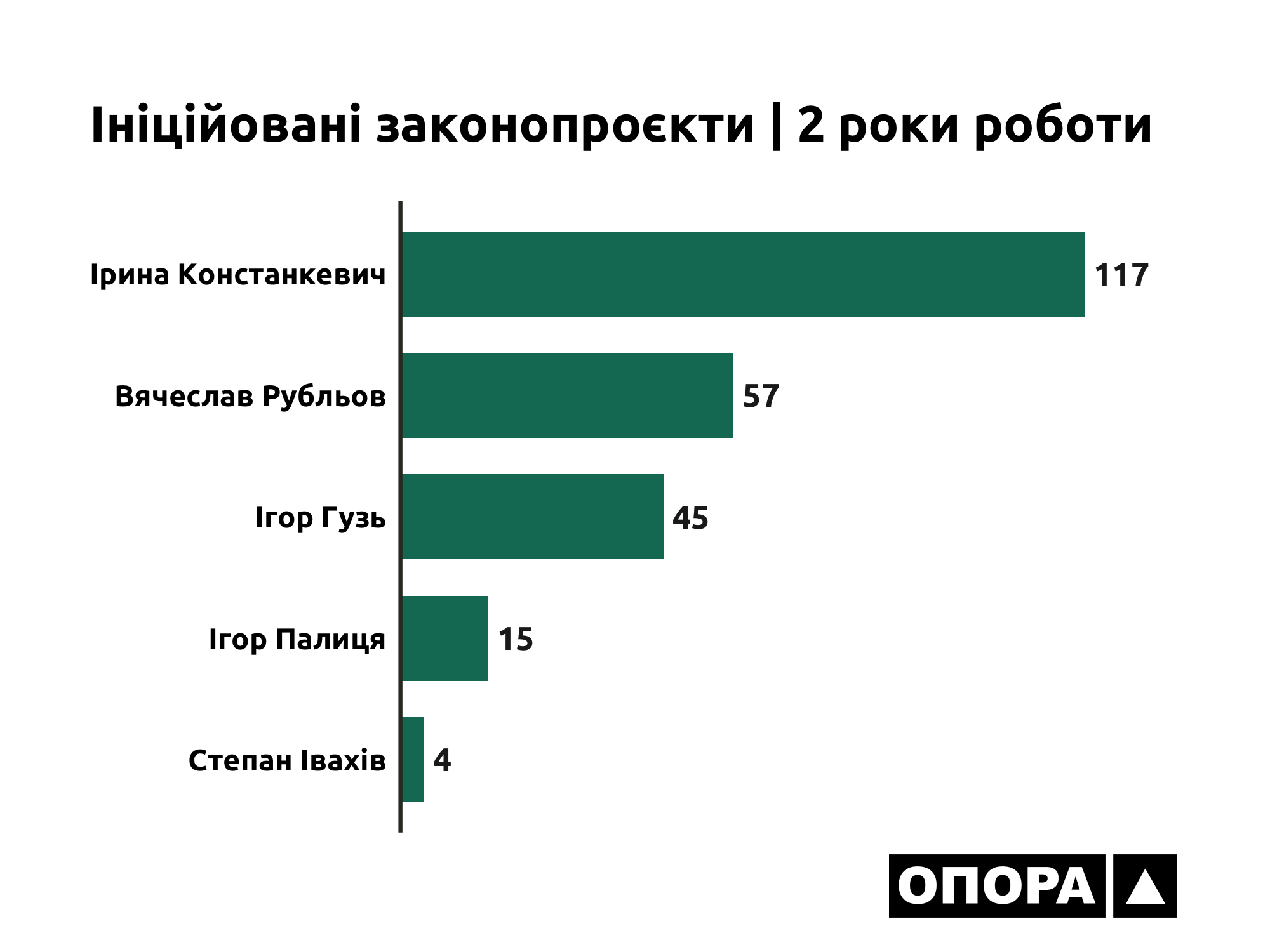 Зокрема, народна депутатка Ірина Констанкевич стала авторкою чи співавторкою 117 проєктів законів та 46 проєктів постанов, нардеп Валерій Стернійчук – та 62 законопроєктів та 11 проєктів постанов, Вячеслав Рубльов – 57 проєктів законів та 22 проєктів постанов, Ігор Гузь – 45 законопроєктів та 20 проєктів постанов, Ігор Палиця – 15 законопроєктів та 6 проєктів постанов, Степан Івахів – 4 проєктів законів.