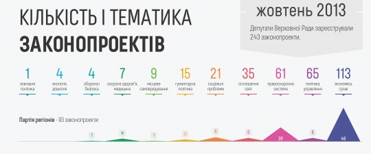 Депутати Партії регіонів зареєстрували 93 законопроекти та постанови, ВО «Батьківщина» - 72, комуністи – 30, ВО «Свобода» - 24. Найменш активними у жовтні в законотворчості були депутати з фракції «УДАР» та позафракційні – по 11 ініціатив. 94 міжфракційні законопроекти та постанови було долучено до загальнопарламентського доробку. Проте таку статистику необхідно сприймати враховуючи чисельність фракцій.