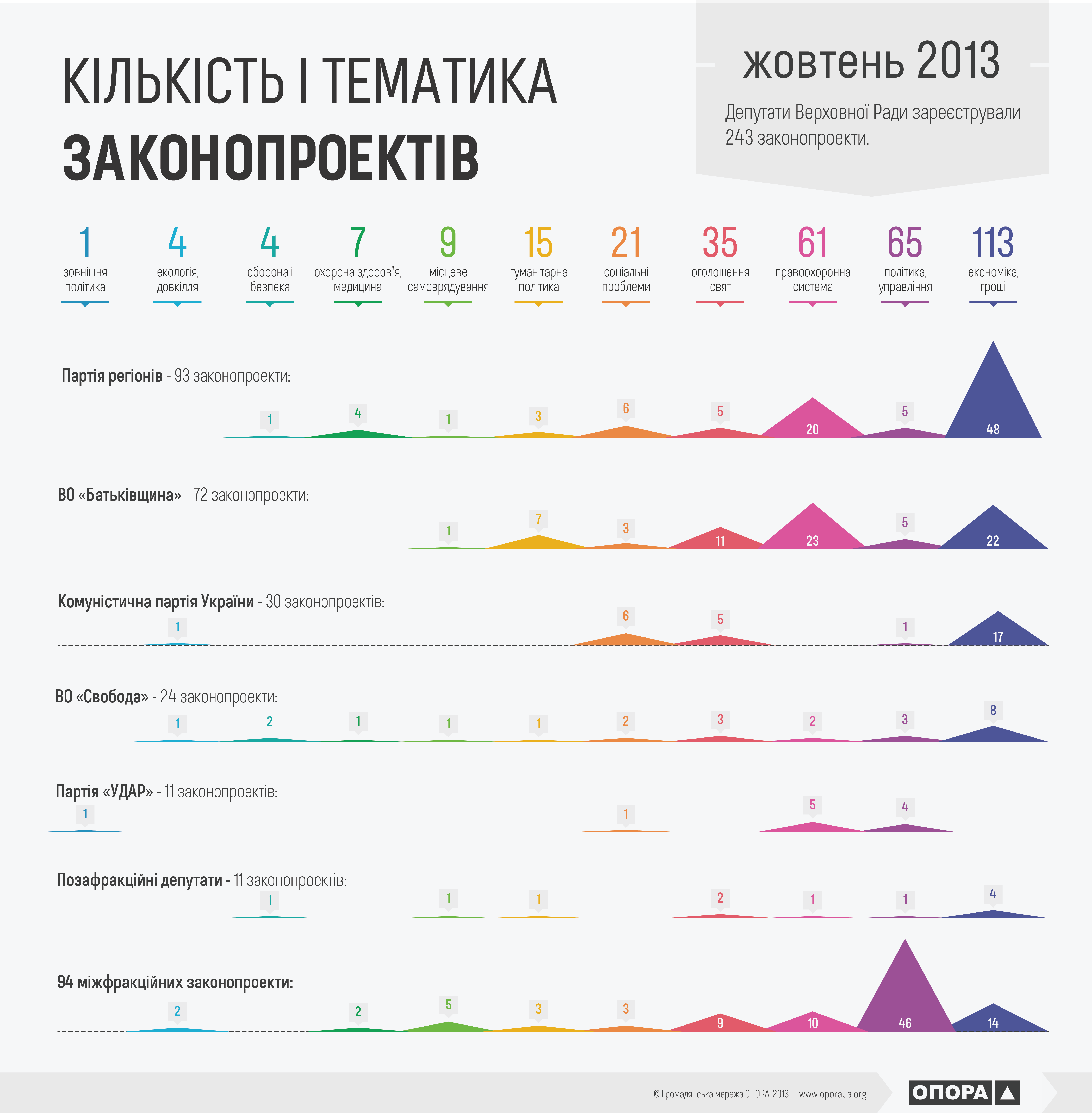 У жовтні 2013 року українські парламентарі зареєстрували 335 законопроектів і постанов. У тематичному ж розрізі абсолютна більшість проектів нормативно-правових актів прямим чином не стосуються зобов’язань України в рамках підписання Угоди про асоціацію з ЄС. Левова частка документів виражає поточні партійно-політичні інтереси чи програмні засади фракцій та окремих депутатів. Громадянська мережа ОПОРА продовжує відслідковувати та аналізувати законотворчу активність народних депутатів Верховної Ради VII скликання.