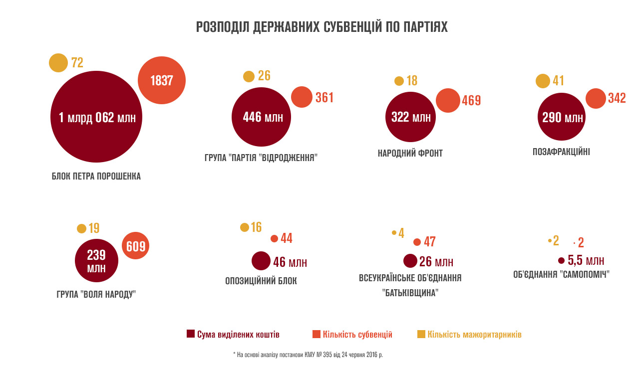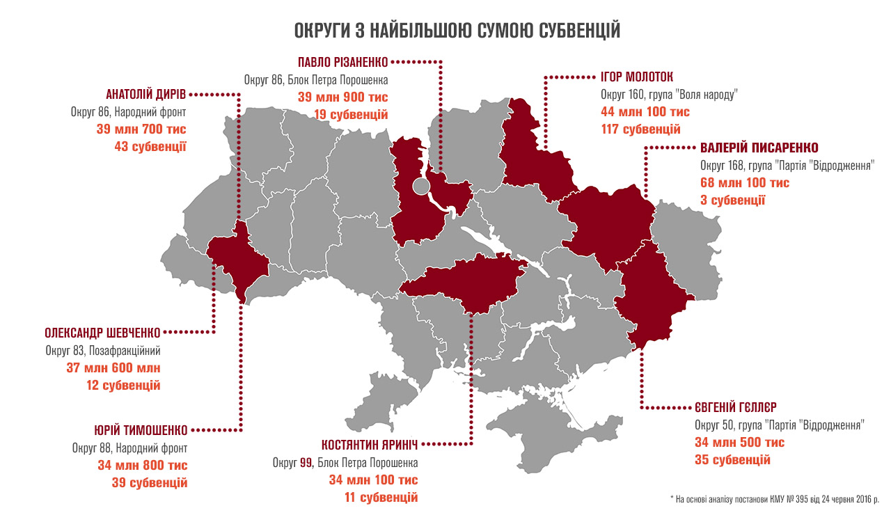 Лише 26 мільйонів гривень були направлені до 4 мажоритарних округів, чиї інтереси у Раді представляють члени фракції “ВО “Батьківщина” і лише 5,5 мільйонів гривень до 2 округів нардепів від “Самопомочі” (усі до 116 округу Ірини Подоляк).