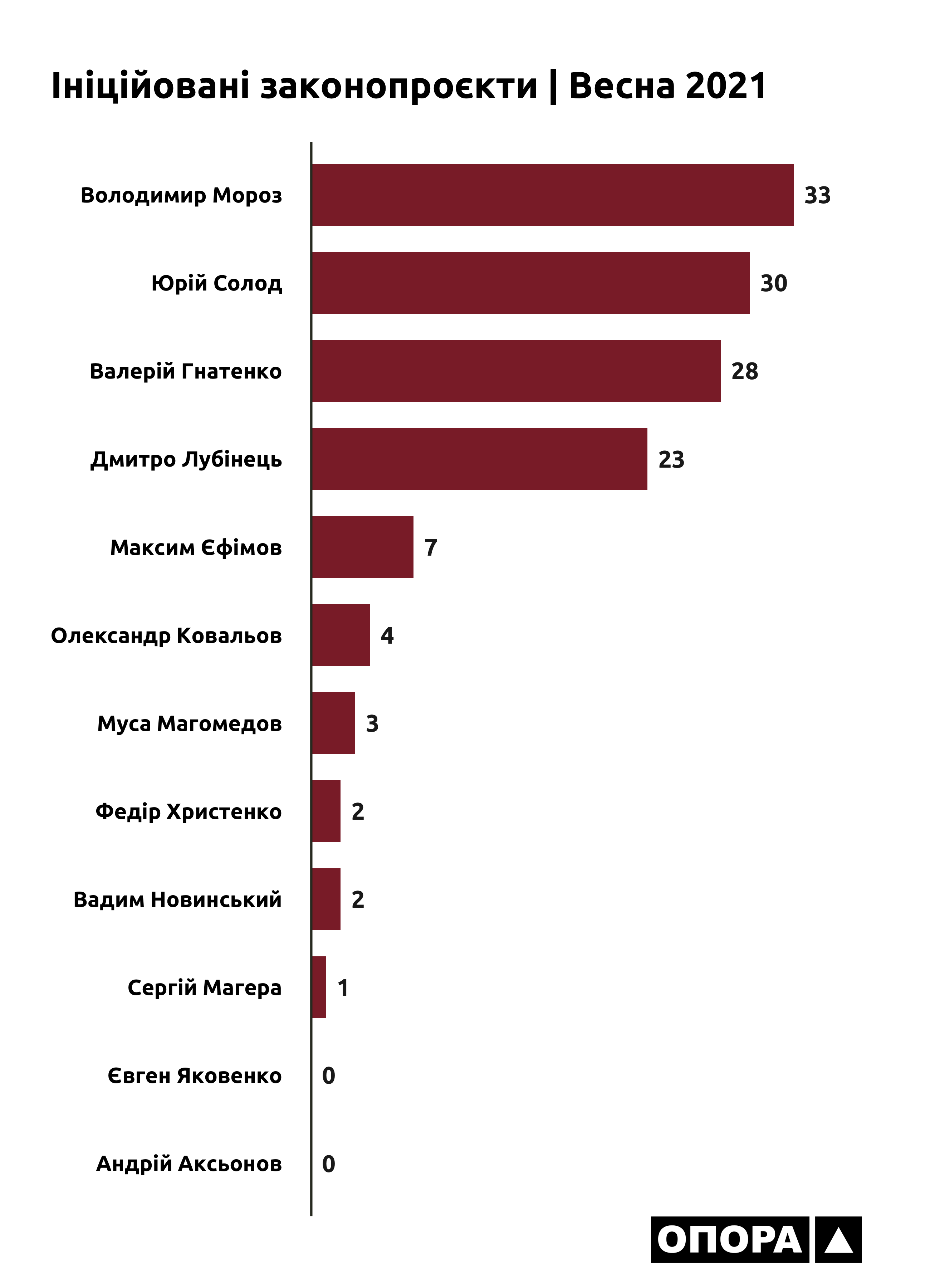 Народні депутати з Донеччини виступали ініціаторами (авторами чи співавторами) кількох десятків законопроєктів. Лідерами тут є представники «Опозиційної платформи – За життя»: Володимир Мороз за весну встиг ініціювати розгляд 33 законопроєктів, Юрій Солод – 30, а Валерій Гнатенко – 28. Їх колега з групи «За майбутнє» Дмитро Лубінець ініціював 23 проєкти. Є ті, хто не надто активно над цим працював: представники депутатської групи «Довіра» Максим Єфімов та Олександр Ковальов подали по 7 та 4 проєкти відповідно, позафракційний Муса Магомедов – 3 проєкти, Федір Христенко з «Опозиційної платформи – За життя» та позафракційний Вадим Новинський – по 2 проєкти, а позафракційний Сергій Магера – тільки 1.