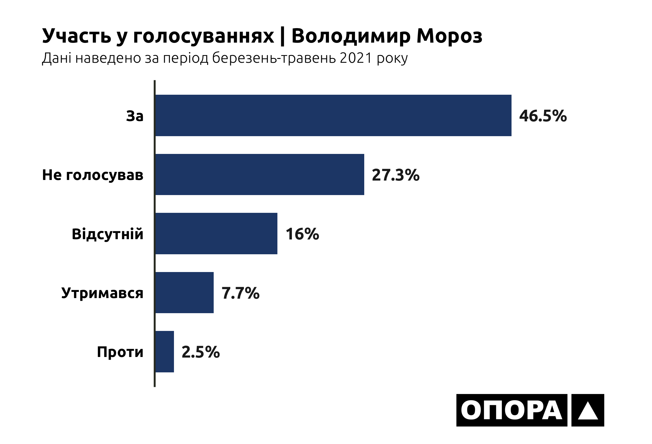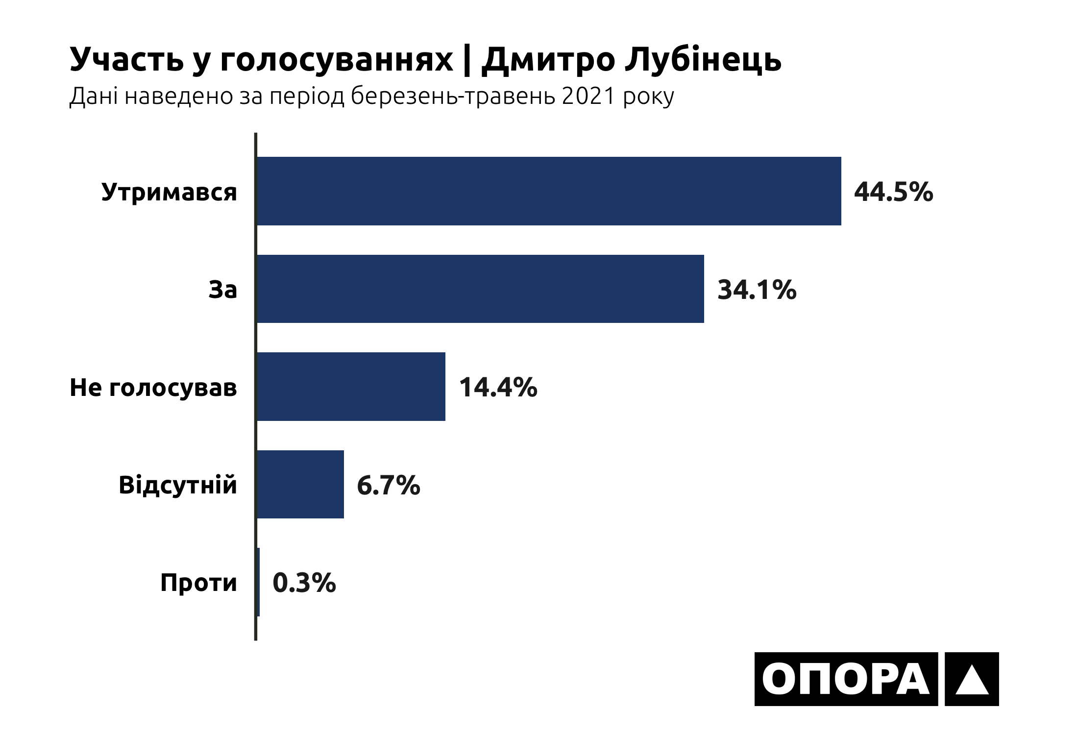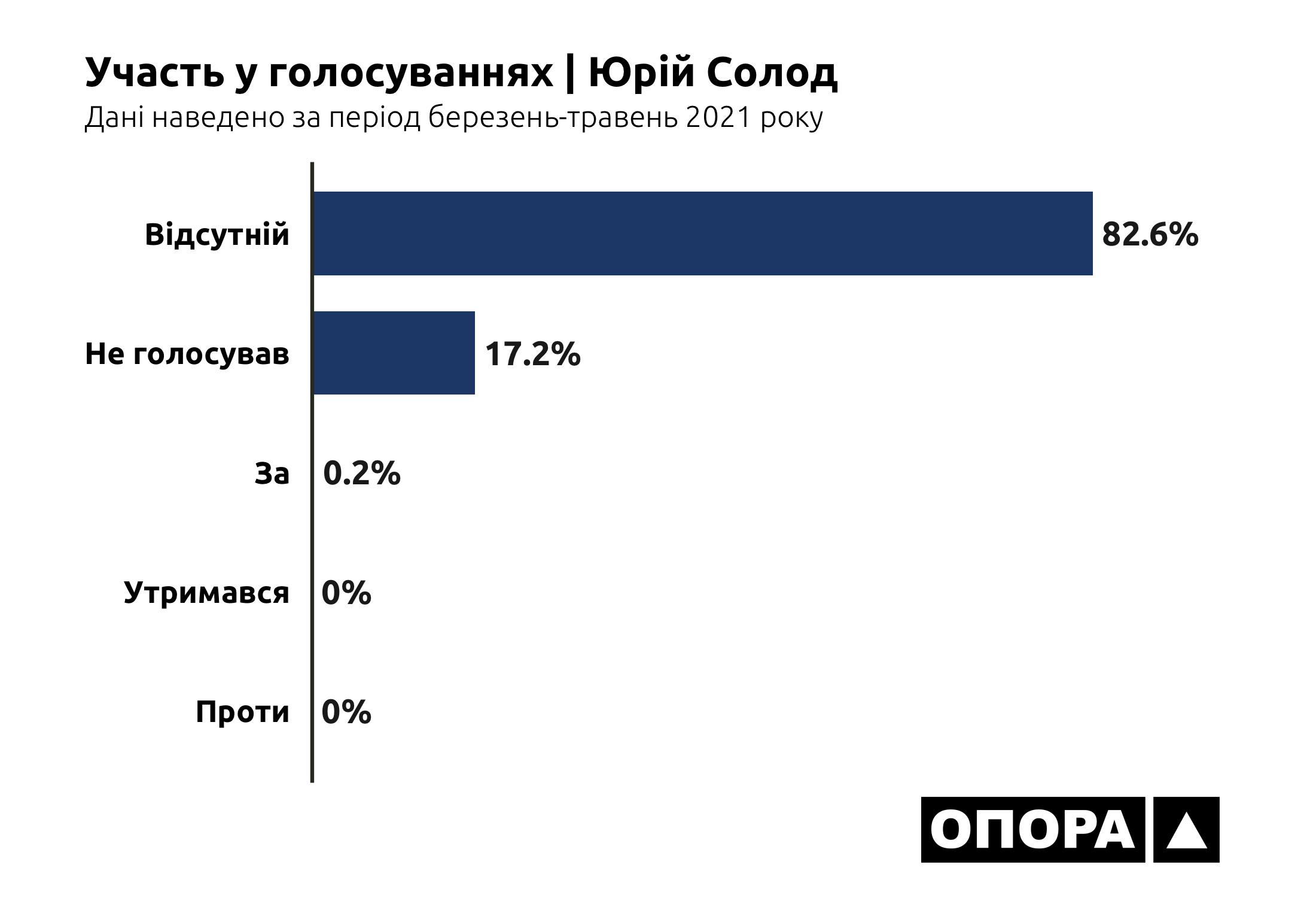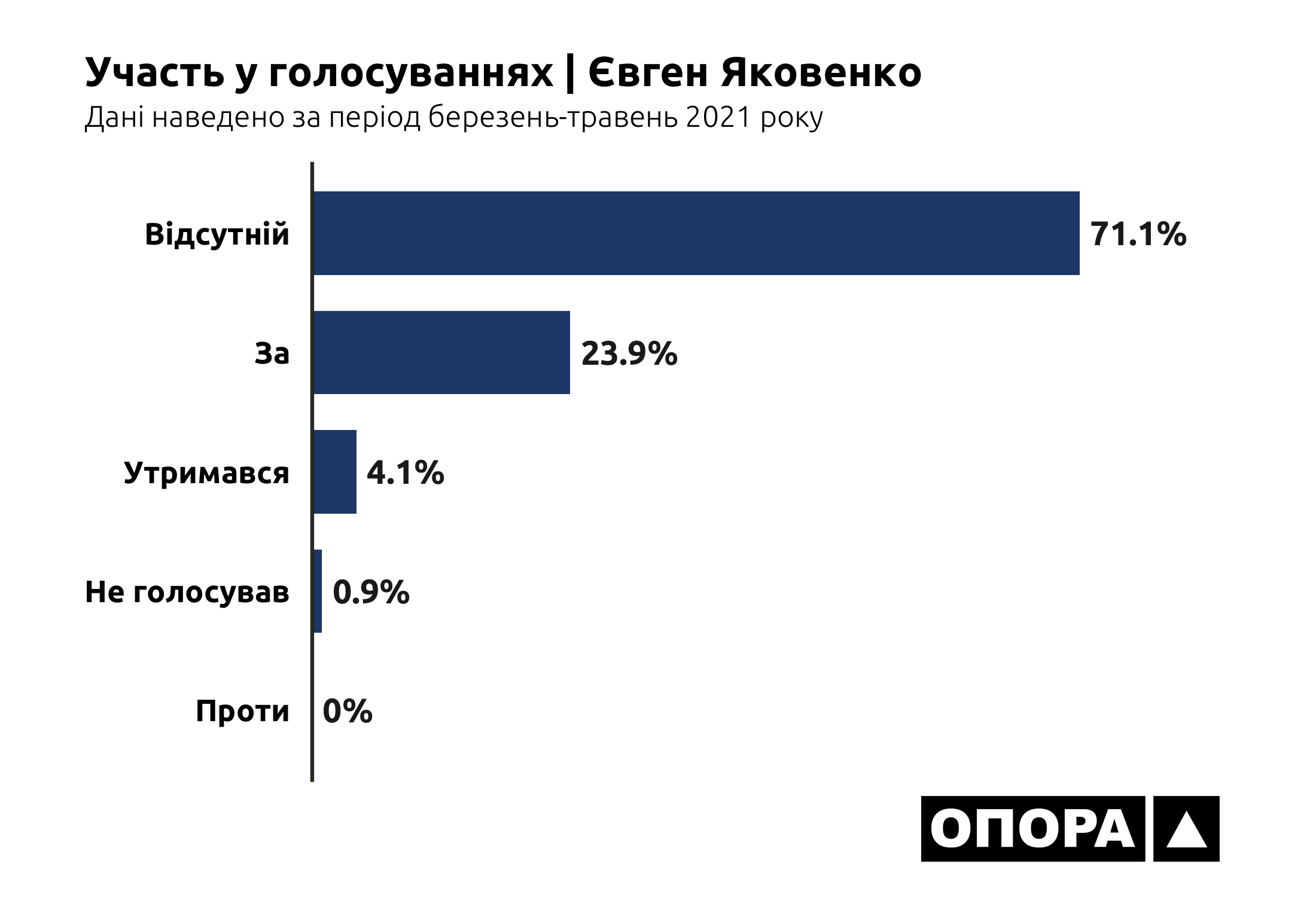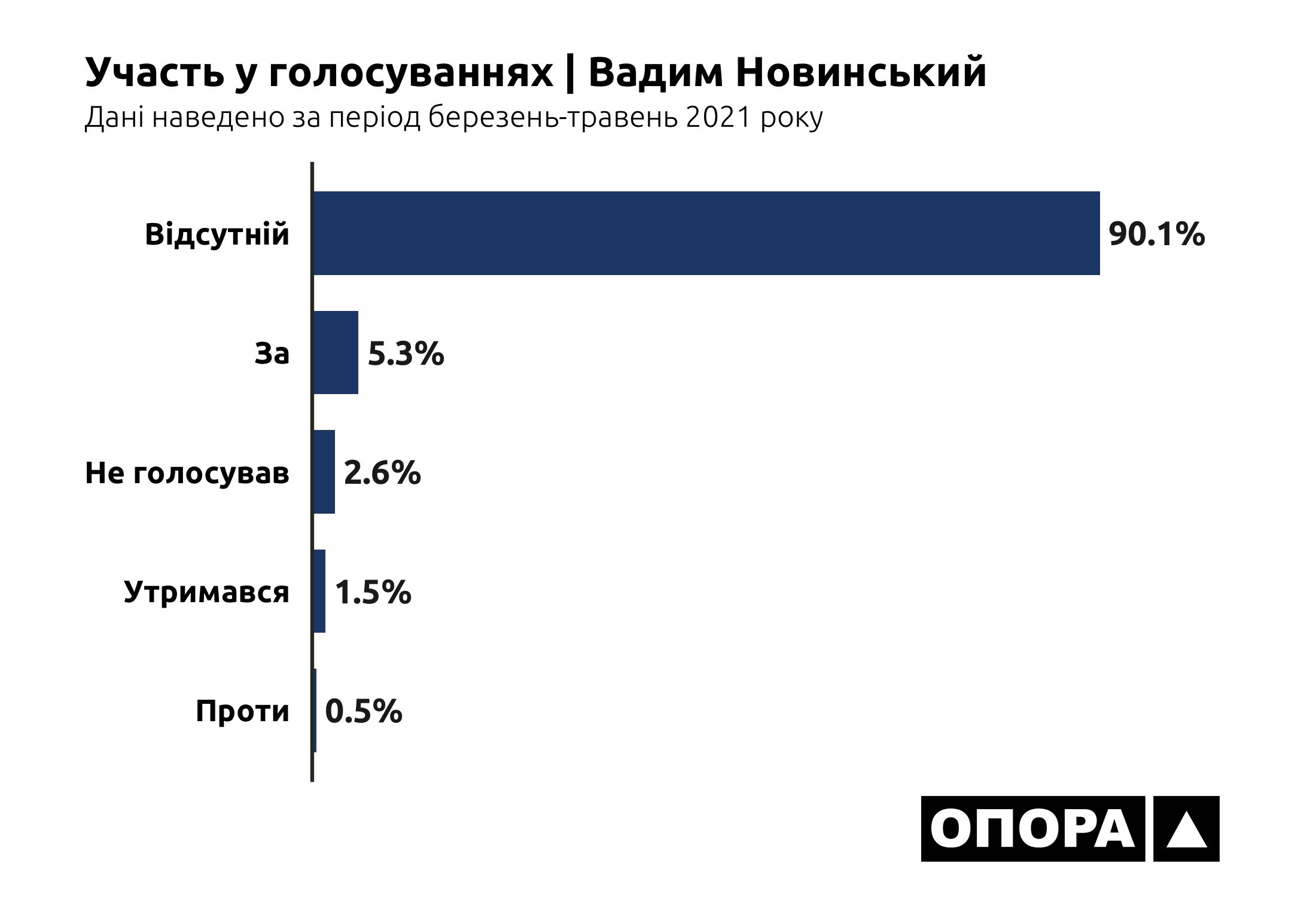 В більшості випадків, а це 6948 голосувань чи 35,3% від загальної кількості, депутати взагалі були відсутні на засіданнях. Ще 4532 (23%) раз представники Донецької області в парламенті не голосували, 2073 (10,5%) раз утримувалися. І тільки в третині випадків депутати з Донеччини хоч якось голосували – в 6042 голосуваннях «за» та в 93 голосуваннях «проти». Тож ОПОРА дослідила, хто з депутатів рідше за інших з’являється на засідання, скільки законопроєктів представники Донеччини ініціювали для розгляду та як вони голосують за конкретні ініціативи.