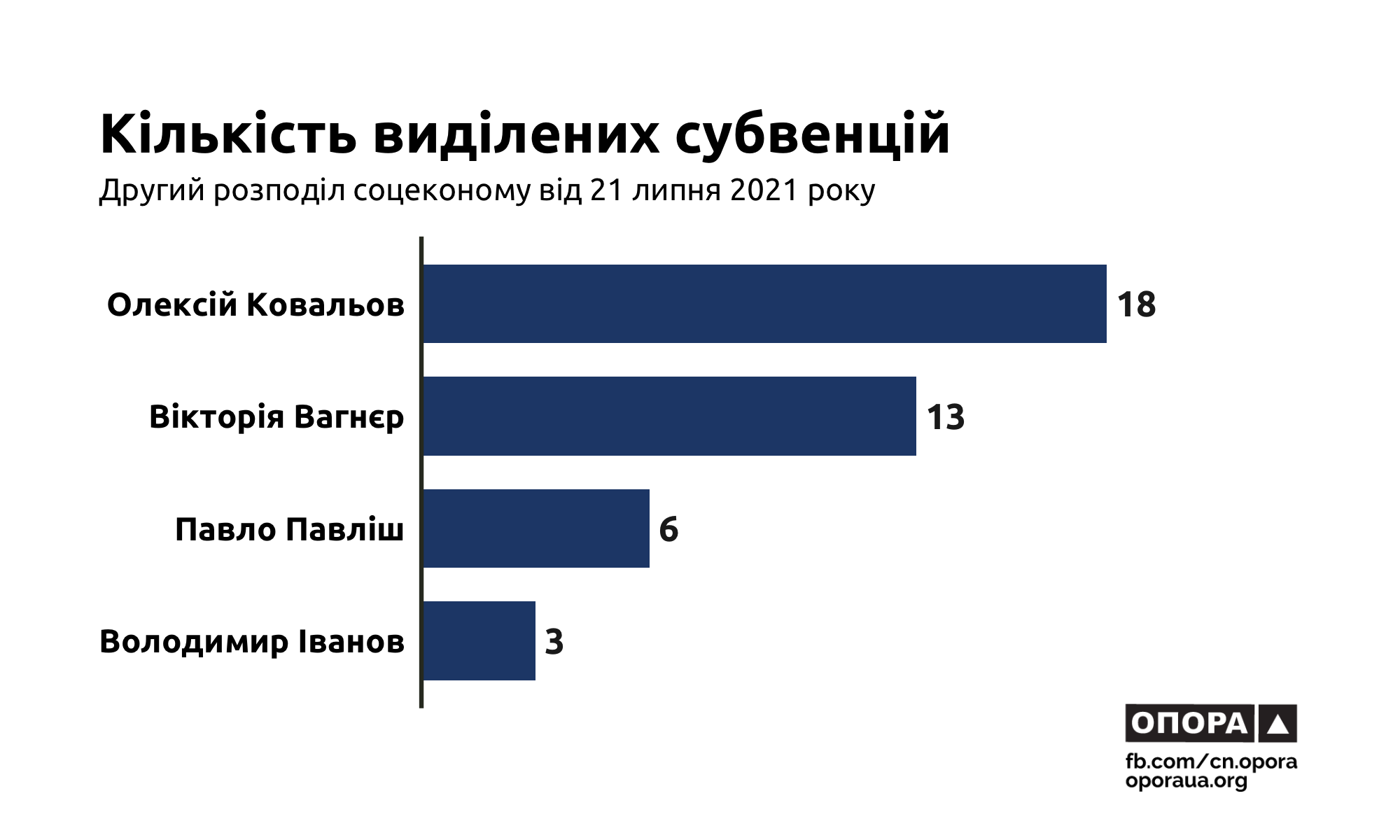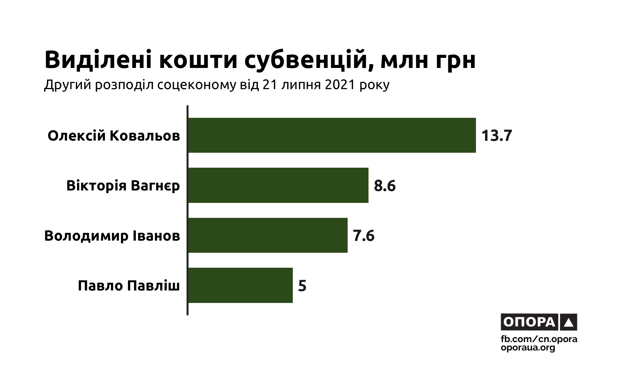 Цього разу найбільше субвенцій отримав виборчий округ №186, який у Верховній Раді представляє висуванець від партії «Слуга народу» Олексій Ковальов. Він «затягнув» на округ 13,7 млн грн. З них 8,57 млн грн – на заклади освіти і 5,13 млн грн – на ЖКГ та інфраструктурні об’єкти. До речі, ці 5,13 млн грн – одна субвенція, яку отримала Чулаківська сільська громада на капітальний ремонт паркової зони у селі Чулаківка. Це – рекордна субвенція у цьому розподілі, більшу суму не отримала жодна з громад.