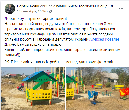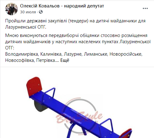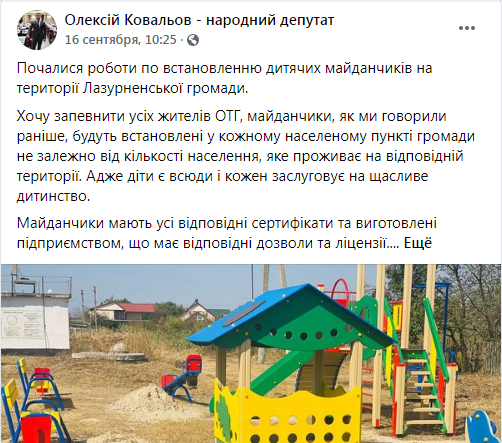 Зокрема, Олексій Ковальов (округ №186) піариться на дитячих майданчиках, встановлених на території Лазурненської громади за кошти ще першого розподілу субвенцій.