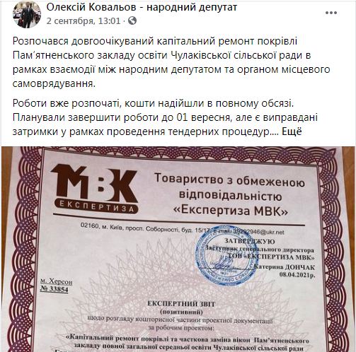 Також Ковальов на своїй сторінці пише про те, як сприяв виділенню коштів на капітальний ремонт покрівлі та часткову заміну вікон Пам’ятненської загальної середньої школи Чулаківської громади. На це ще під час першого розподілу субвенцій було виділено 2,8 млн грн.