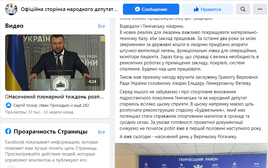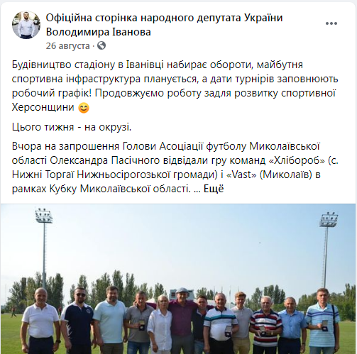 Також депутат «ненав’язливо» нагадує виборцям про свій внесок у реконструкцію стадіону «Колос» у селищі Іванівка, на що під час першого розподілу коштів було виділено 3 млн грн.