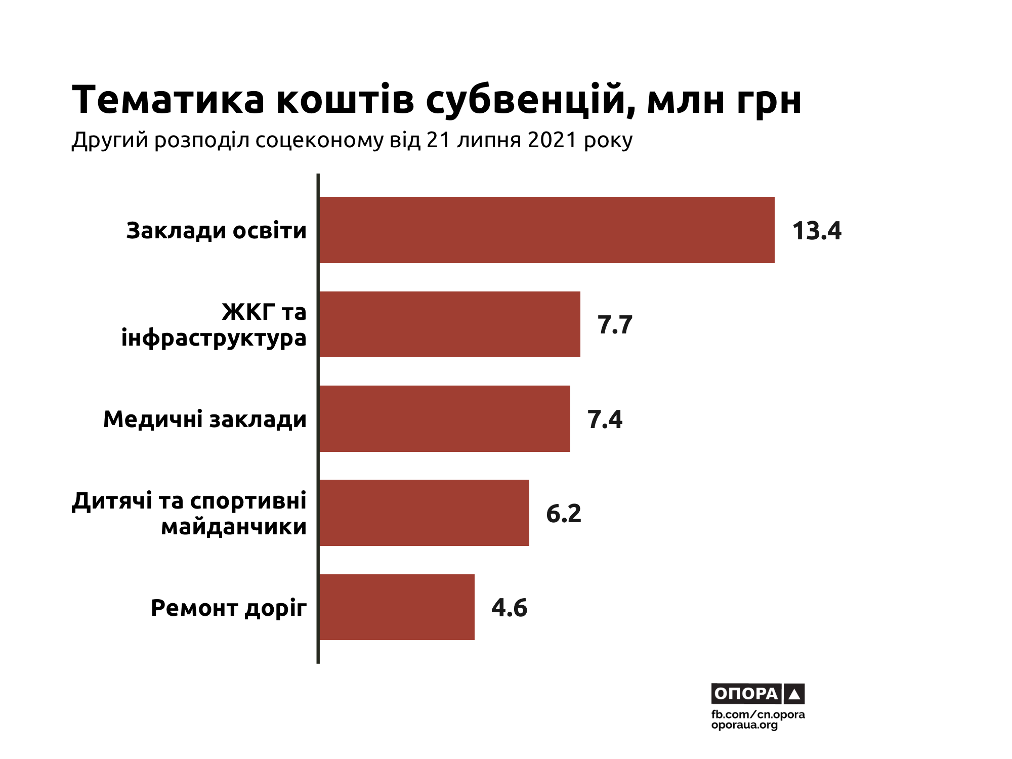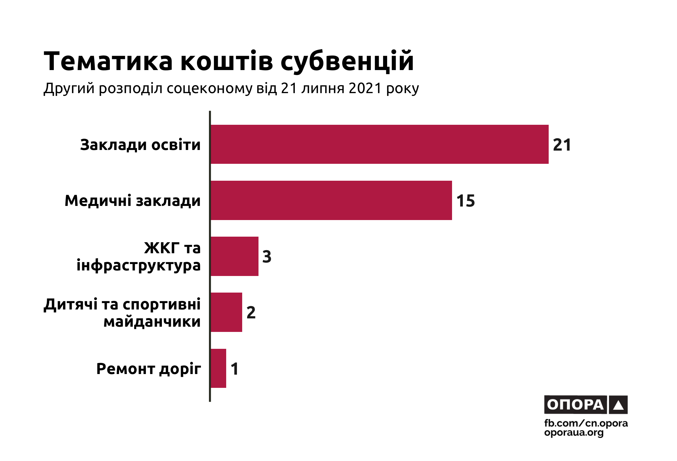 Якщо під час першого розподілу на першому місці за тематикою були субвенції на медичні заклади, які отримали 13 субвенцій, то у другому розподілі безперечний лідер – заклади освіти – 21 субвенція на загальну суму 13,4 млн грн.