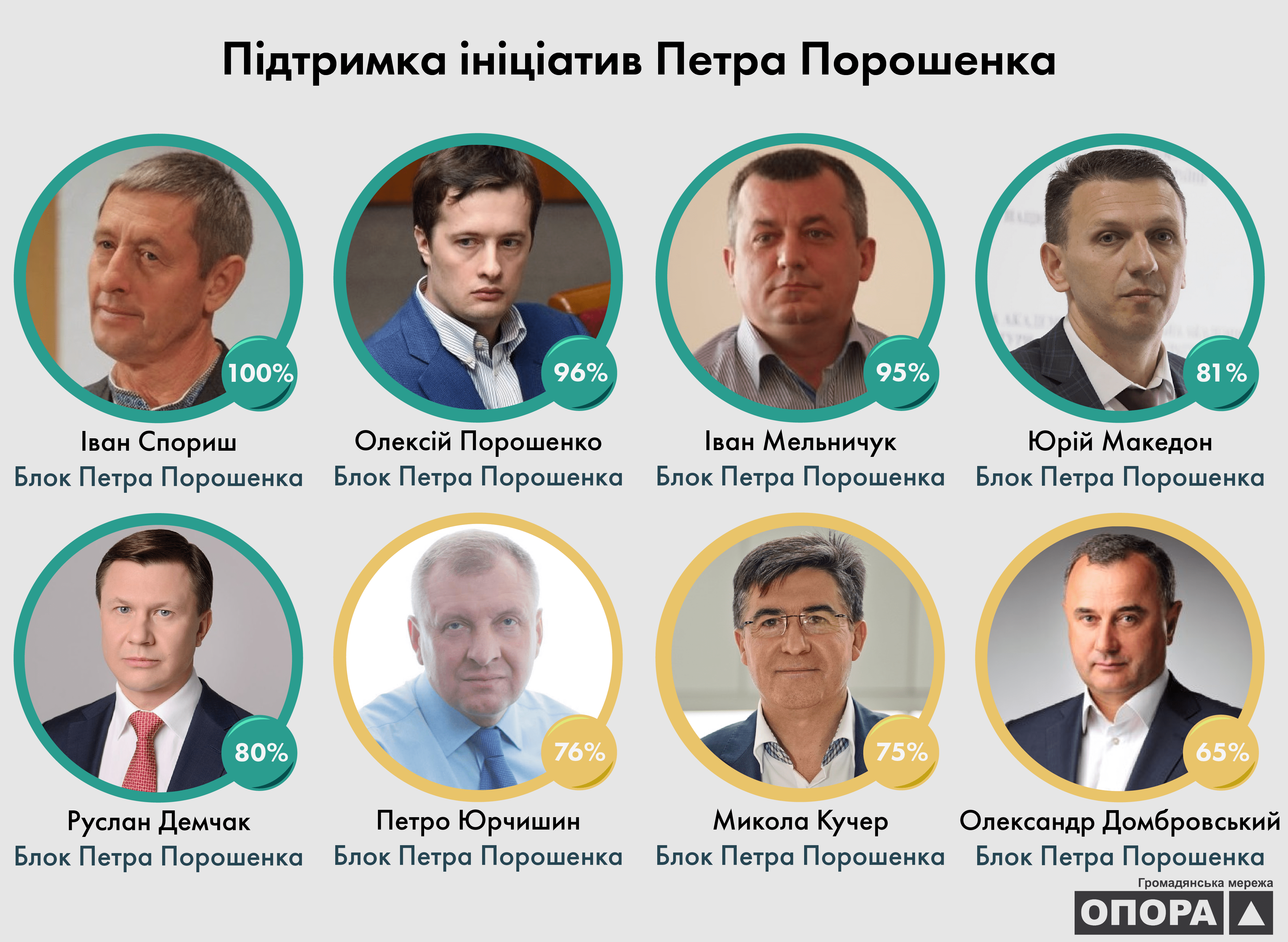 За перші два роки каденції Петро Порошенко мав одні з найвищих показників підтримки депутатами Вінницької області – 84%. Максимально ініціативи Президента підтримував Іван Спориш, який у 100% випадків голосував “за”. Високі показники підтримки ініціатив, зареєстрованих Порошенком, демонстрували і депутати Олексій Порошенко, Іван Мельничук, Юрій Македон та Руслан Демчак – від 80 до 100% підтримки. Менш активно законопроєкти Президента підтримували Петро Юрчишин, Микола Кучер та Олександр Домбровський, які голосували “за” у 65-76% випадках. Жоден депутат ніколи не голосував “проти”. Петро Юрчишин, Микола Кучер, Олександр Домбровський та Руслан Демчак не голосували під час 16% голосувань.