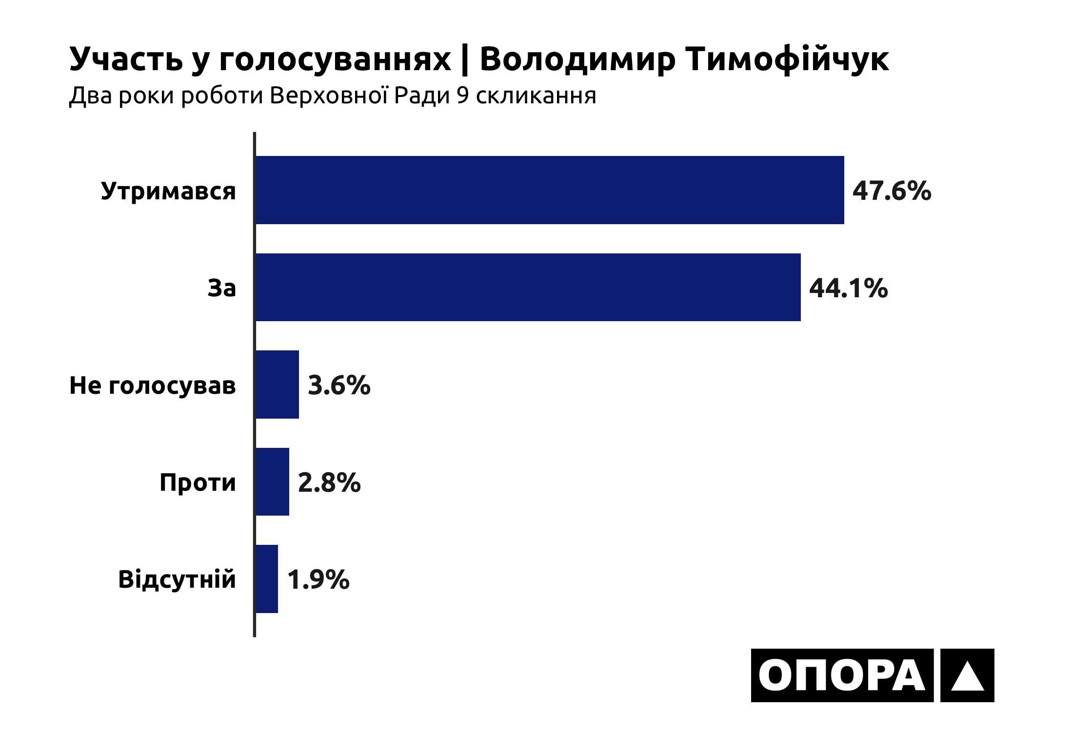 На опрацюванні комітетів Верховної Ради перебувають 34 законопроєкти співавторства Володимира Тимофійчука, 12 очікують розгляду, 7 готуються на друге читання, 2 повернуто на доопрацювання, розгляд одного законопроєкту відкладено, 7 відхилено, 2 законопроєкти ухвалені та готуються на підпис президента, а 1 враховано як поправку.