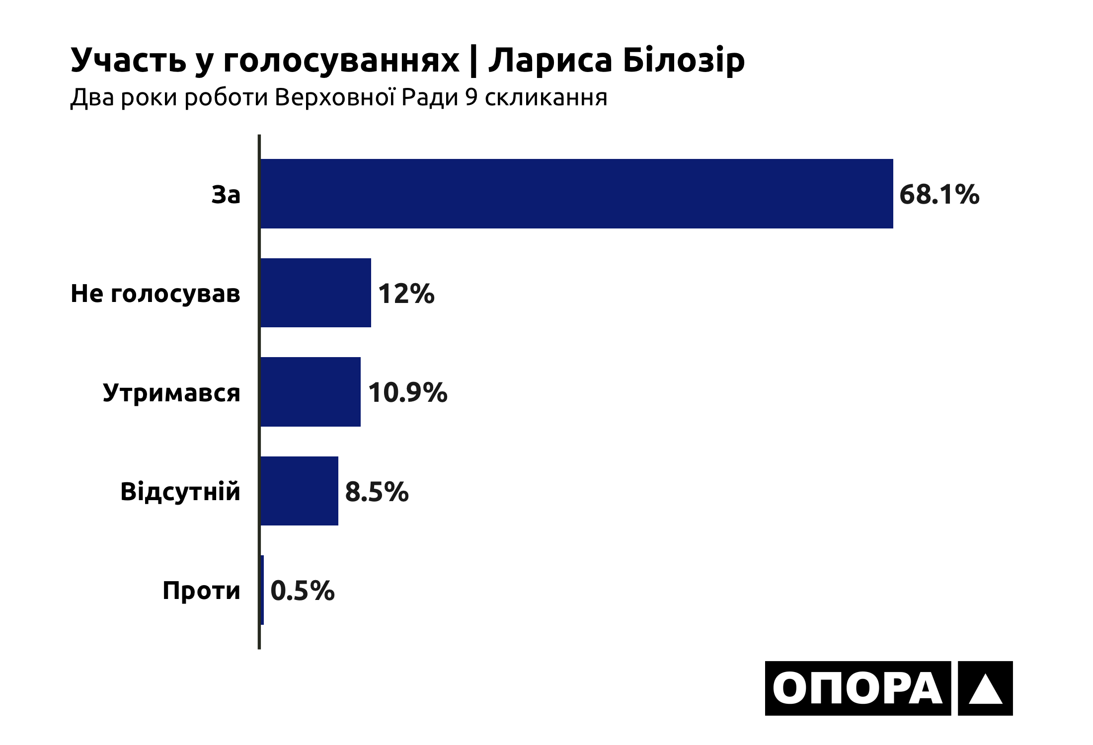 Лідеркою серед голосувань «За» була народна депутатка Лариса Білозір 68,1%. Проти в голосуваннях найчастіше були Олег Мейдич (1,6%) та Максим Пашковський (1,3%).