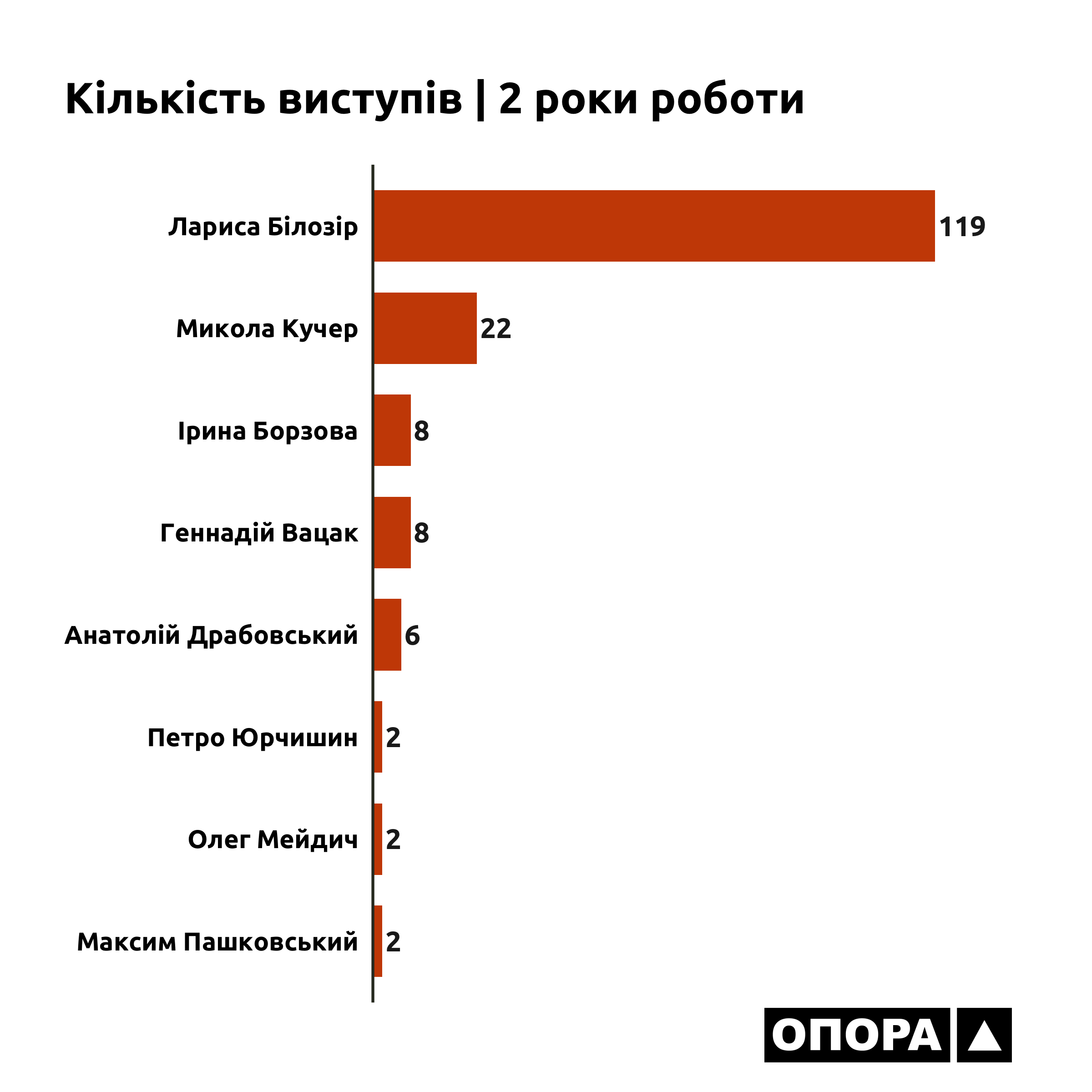 По вісім виступів мали Ірина Борзова та Геннадій Вацак, шість разів брав слово Анатолій Драбовський.