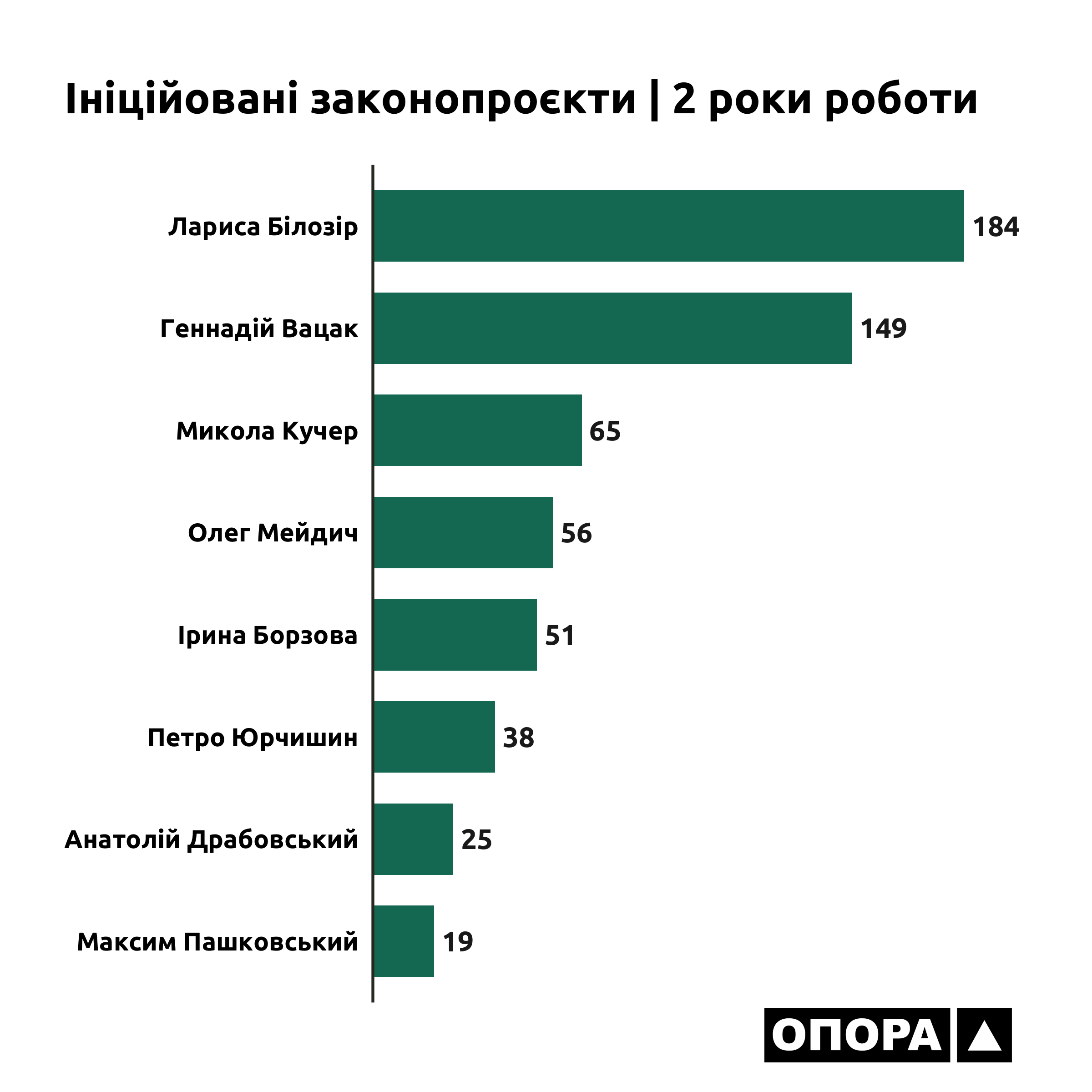 Авторами чи співавторами найбільшої кількості законодавчих ініціатив за два роки роботи Ради серед вінничан стали Лариса Білозір (184) та Геннадій Вацак (149). Найменше законодавчих ініціатив подали Максим Пашковський (19) та Анатолій Драбовський (25).
