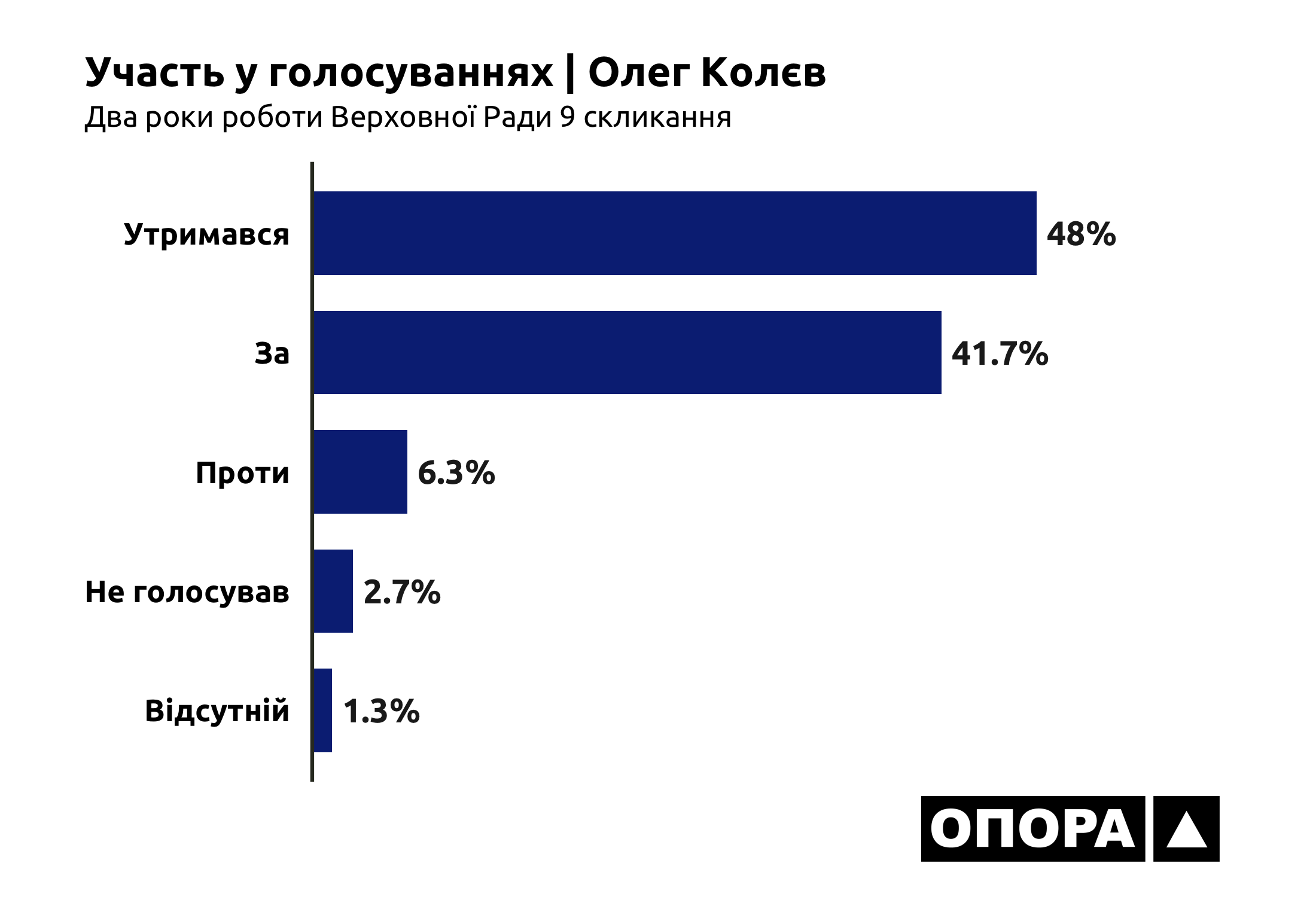Олег Колєв також має найнижчий показник відсутності під час голосувань у залі засідань Верховної Ради – 1,3%. Натомість його колеги по фракції Ігор Васильковський та Олександр Горенюк мають найвищі показники відсутності під час голосувань – 36,9% та 20,1% відповідно.