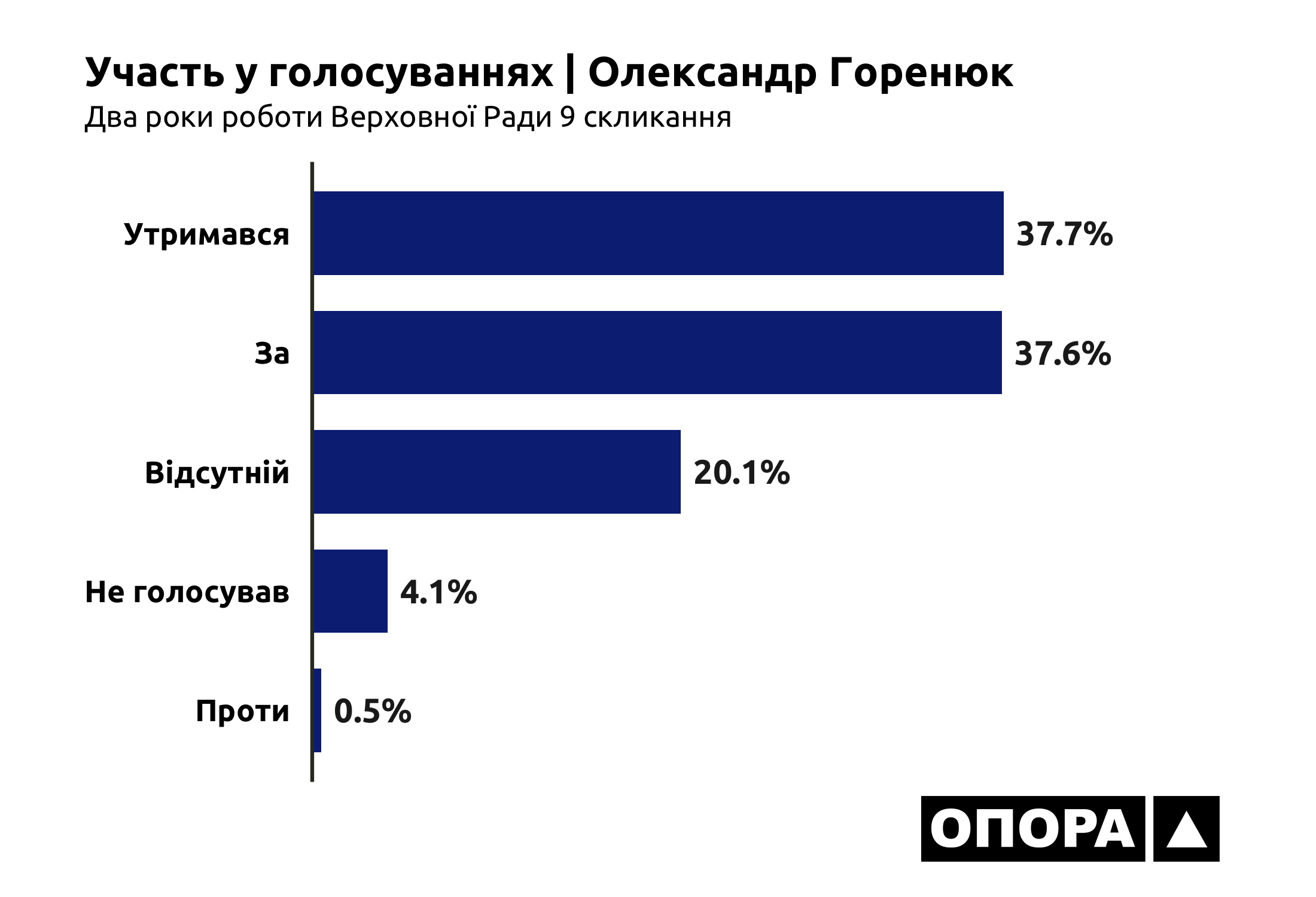 На один законопроєкт менше, ніж в Олександра Ткаченка, має Олександр Горенюк. Він став співавтором 46 законодавчих ініціатив. Олександр Горенюк зареєстрував 15 проєктів законів у сфері економічної політики, по 13 – у сферах галузевого розвитку і правової політики, три – державного будівництва і два – соціальної політики.