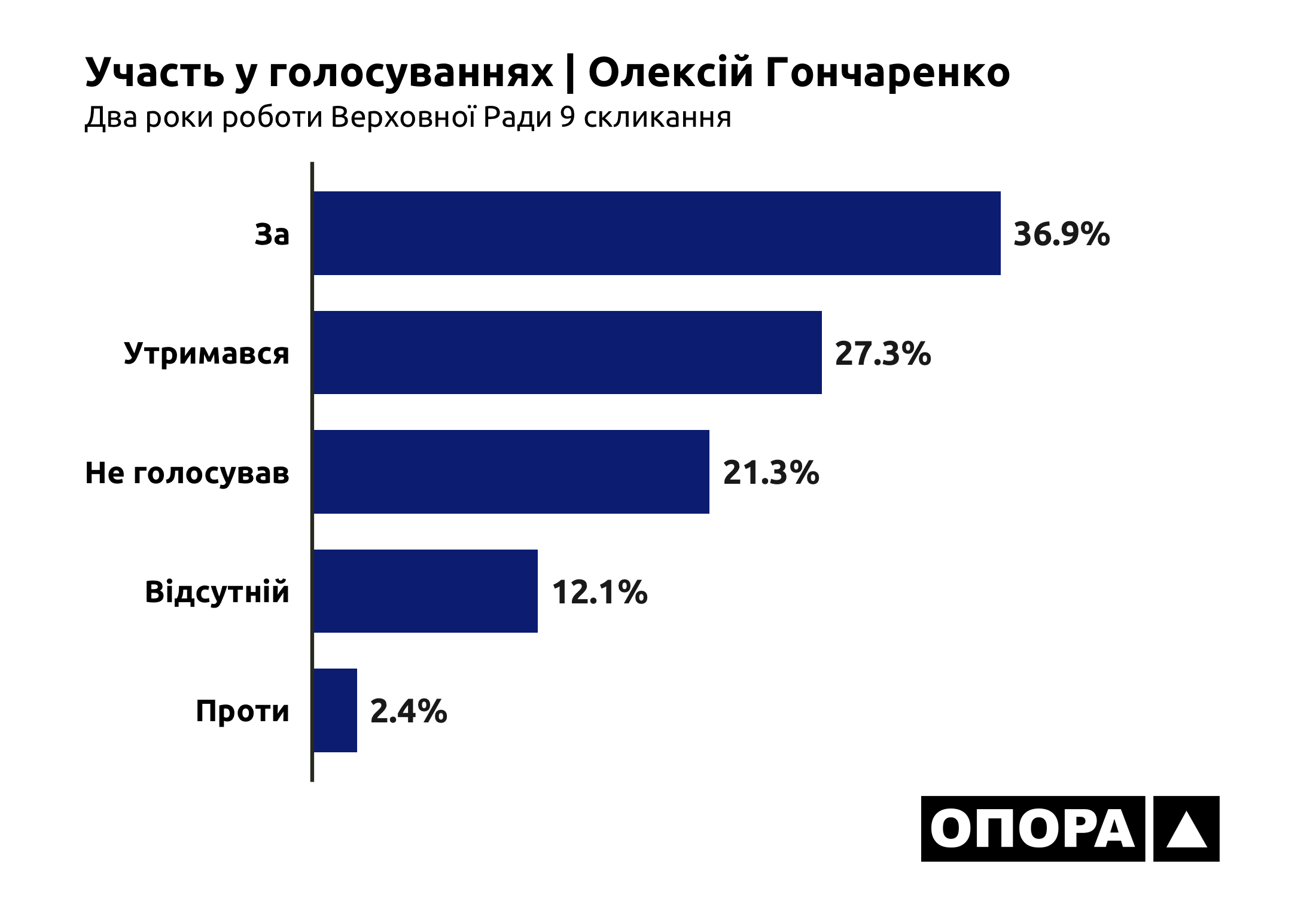 Олексій Гончаренко був найбільш активним в частині виступів на пленарних засіданнях парламенту та має найбільшу кількість зареєстрованих законопроєктів. Цікаво, що він найчастіше серед одеських нардепів голосує проти лінії своєї фракції.