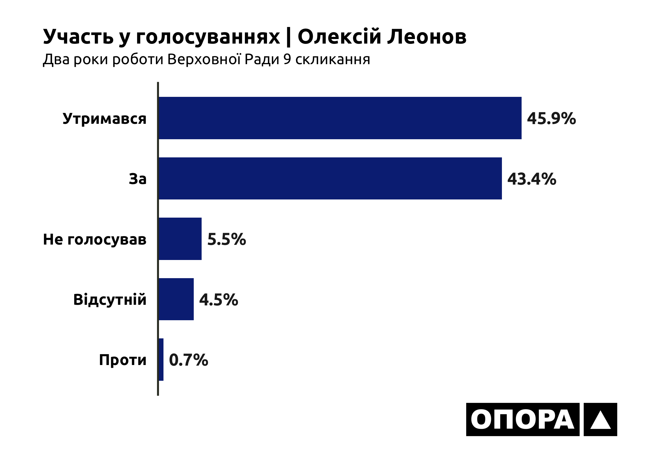 Дещо менше (36,2% голосувань) одеські парламентарі натискають кнопку «Утримався» під час голосувань на пленарних засіданнях. Найчастіше серед одеських мажоритарників утримуються під час голосувань Олег Колєв (48%), Олексій Леонов (45,9%) і Сергій Колебошин (45%). Найменшим цей показник є в Анатолія Урбанського, який натискав кнопку «Утримався» у 18,3% своїх голосувань.
