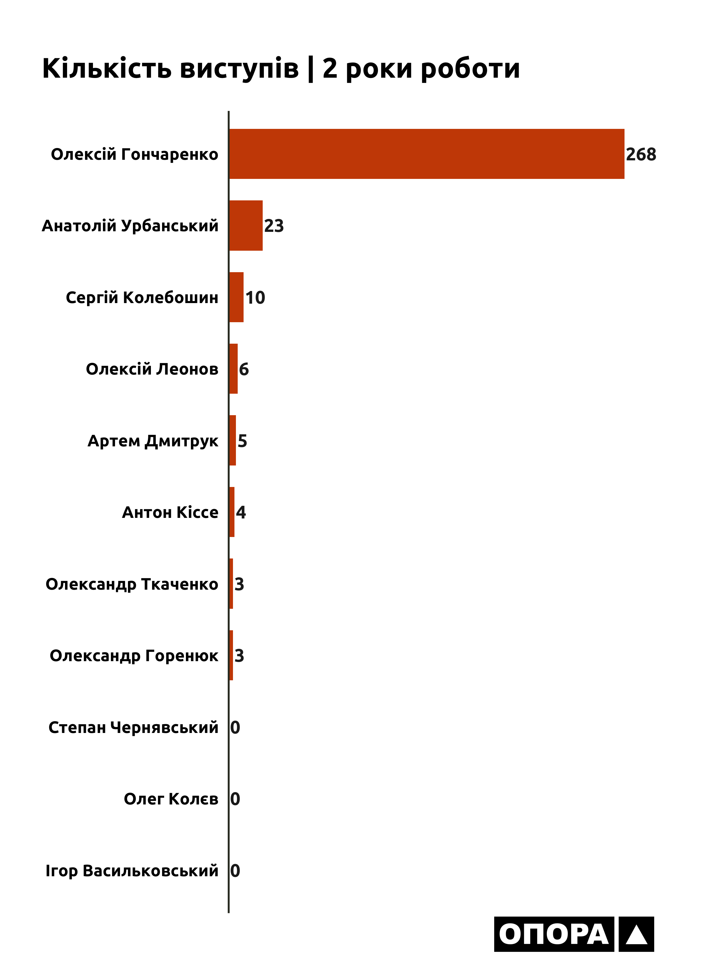 Найбільшу ж кількість серед одеських парламентарів слово брав Олексій Гончаренко – 268 разів. Цікаво, що Олексій Гончаренко має перевагу за виступами серед одеських мажоритарників більш, ніж в 10 разів, оскільки другий за кількістю виступів Анатолій Урбанський брав слово 23 рази.