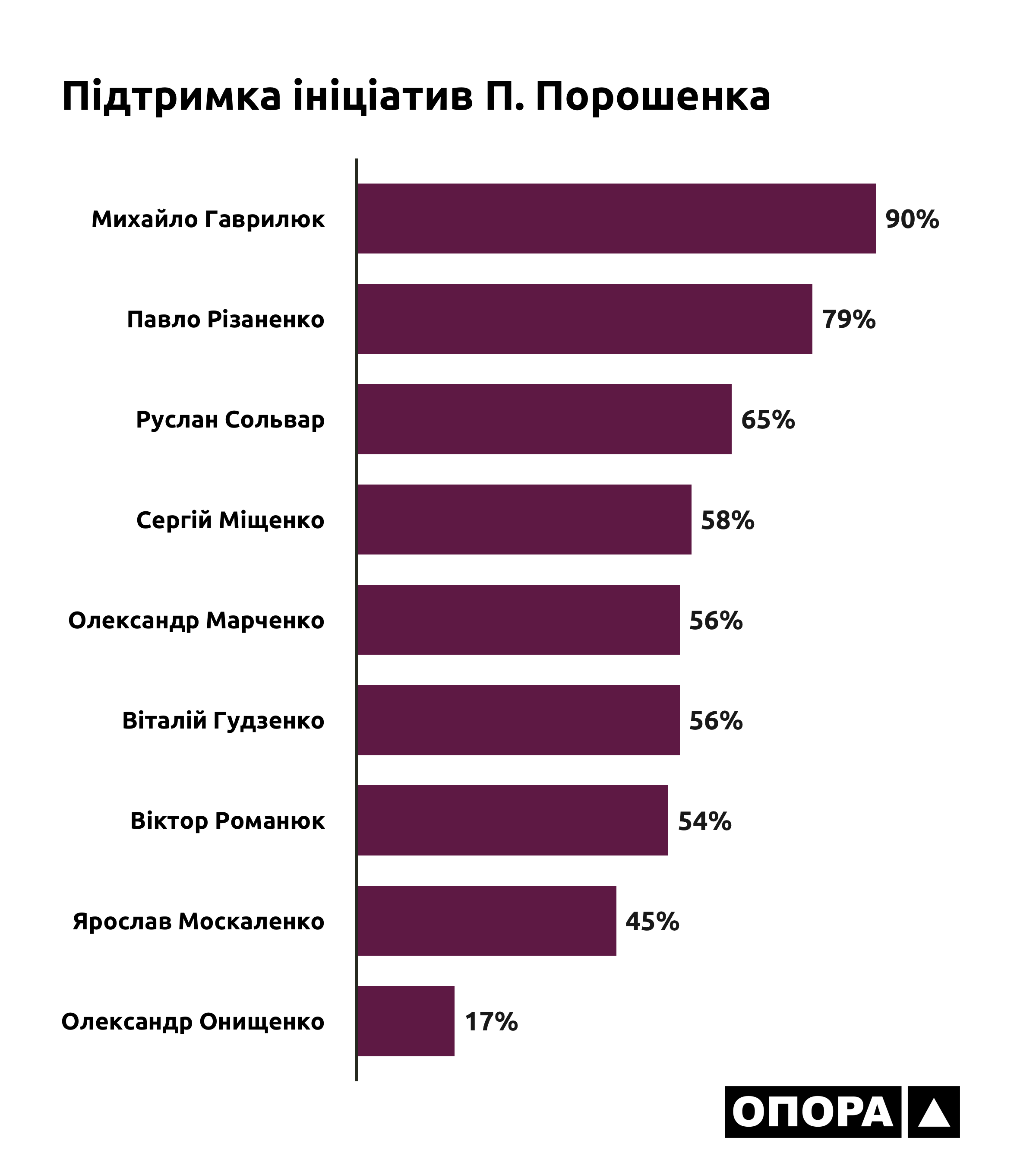 За перші два роки своєї каденції найбільший рівень підтримки законодавчих ініціатив, серед депутатів мажоритарників Київщини, Петро Порошенко отримав від Михайла Гаврилюка, парламентар голосував «За» законопроекти подані президентом в 90% випадків найменшим же був рівень підтримки від Олександра Онищенка – 17% випадків. Втім слід зазначити, що такий низький рівень підтримки ініціатив президента Олександром Онищенком пов’язаний в першу чергу з тим, що той не брав участь в більшості голосувань протягом своєї каденції - відсутній в 50.5% голосувань за ініціативи Президента. Адже у 2016 році проти депутата було порушено кримінальну справу зі звинуваченням в корупції після чого він покинув Україну. Якщо не враховувати Олександра Онищенка, то найнижчий рівень підтримки Петро Порошенко Отримував від Ярослава Москаленка – 45%, котрий як і Онищенко балотувався шляхом самовисування і після отримання мандату увійшов до депутатської групи «Воля Народу». Всі решта парламентарів Київщини підтримували ініціативи Петра Порошенка більш як на 50%. Віктор Романюк – 54%, Віталій Гудзенко – 56%, Олександр Марченко – 56%, Сергій Міщенко – 58%, Руслан Сольвар – 65%, Павло Різаненко – 79%.