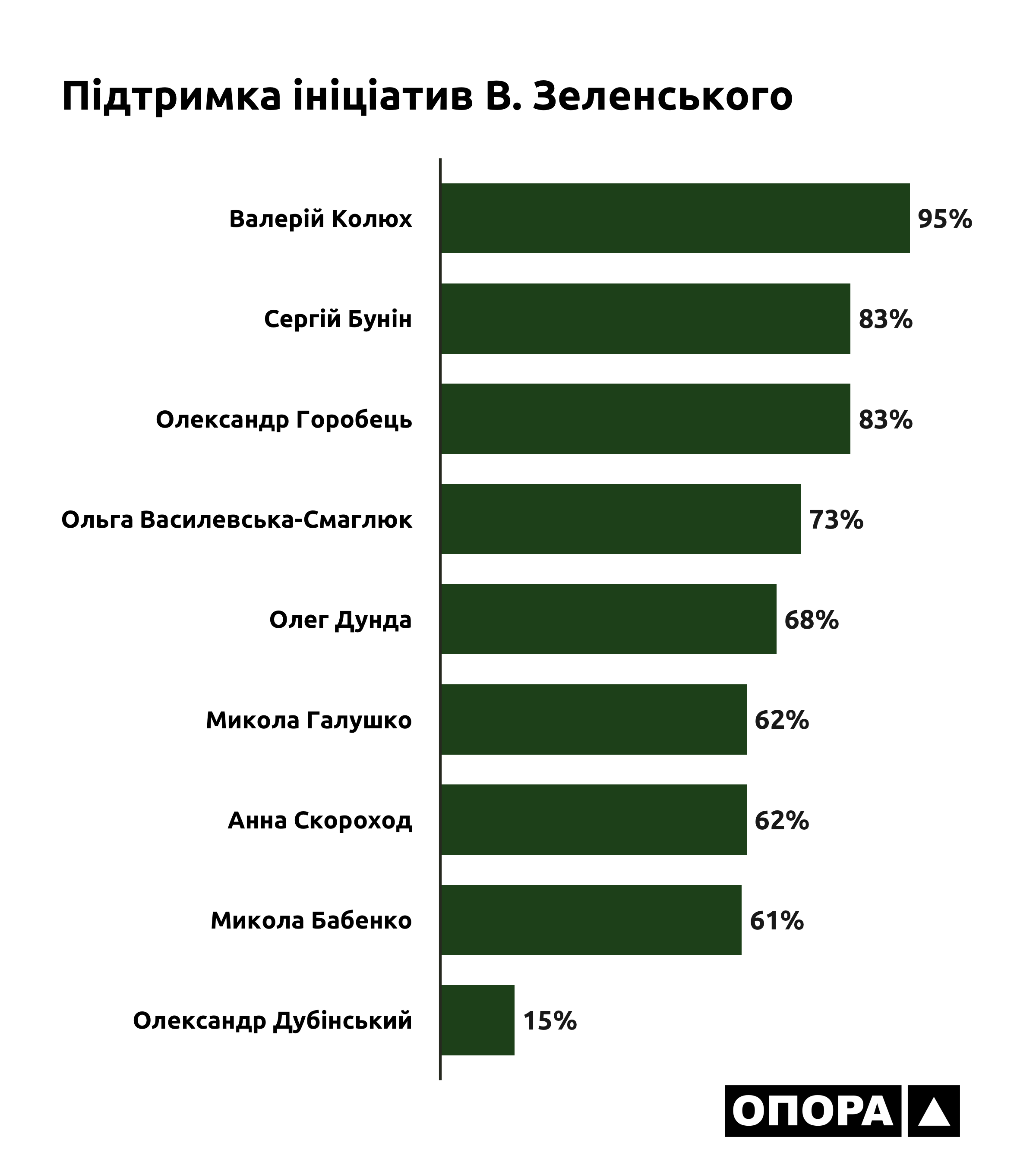 За аналогічний термін перебування на посаді, показник підтримки Володимира Зеленського народними депутатами Київщини в середньому є вищим ніж в його попередника. Так 8 з 9 депутатів підтримують ініціативи Президента більш як на 60%. Нижчий показник має лише Олександр Дубінський котрий підтримував Президента приблизно у 15% голосувань. Як і у випадку Олександра Онищенка, низька підтримка голосувань за президентські законопроекти Дубінського випливає з його відсутності в сесійній залі Верховної Ради України. Так депутат пропустив голосування стосовно 68 законопроектів поданих Зеленським, що становить 54.4%. Цікавим є той факт, що низька підтримка від Олександра Дубінського спостерігалась ще до того як його було виключено з фракції політичної партії «Слуга Народу» на початку 2021 року. Крім Дубінського найнижчу підтримку Володимир Зеленський отримує від Миколи Бабенка – 61%, єдиного парламентаря Київщини котрий обрався не від президентської політичної сили. По 62% підтримки ініціативи глави держави отримують від Анни Скороход та Миколи Галушка. При цьому Анна Скороход була першою серед парламентарів кого виключили з фракції «Слуги Народу» і нині входить до складу депутатської групи «За Майбутнє», а Микола Галушко восени 2020 року, під час кампанії місцевих виборів публічно звинувачував в корупції обласний осередок своєї партії очільником котрого на той час був вже згаданий Олександр Дубінський. Рівень підтримки ініціатив Володимира Зеленського рештою депутатів є наступним: Олег Дунда – 68%, Ольга Василевська-Смаглюк – 73%, Олександр Горобець – 83%, Сергій Бунін – 83%, Валерій Колюх – 95%.
