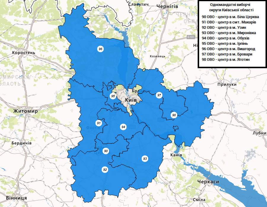 На позачергових парламентських виборах 2014 року, на 9 ОВО округах Київської області, представники президентської політичної сили «Блок Петра Порошенка «Солідарність», здобули перемогу в 3 ОВО, а саме Руслан Сольвар в ОВО №91, Віталій Гудзенко в ОВО №92 та Павло Різаненко в ОВО №97. Крім них Київщина обрала ще 3 самовисуванців: серед яких Олександр Онищенко в ОВО №93, Ярослав Москаленко в ОВО №96, Сергій Міщенко в ОВО №98, 2 представників політичної партії «Народний Фронт»: Віктор Романюк в ОВО №94, Михайло Гаврилюк в ОВО №95 та 1 представника від політичної партії «Всеукраїнське об’єднання «Свобода» - Олександра Марченка в ОВО №90.