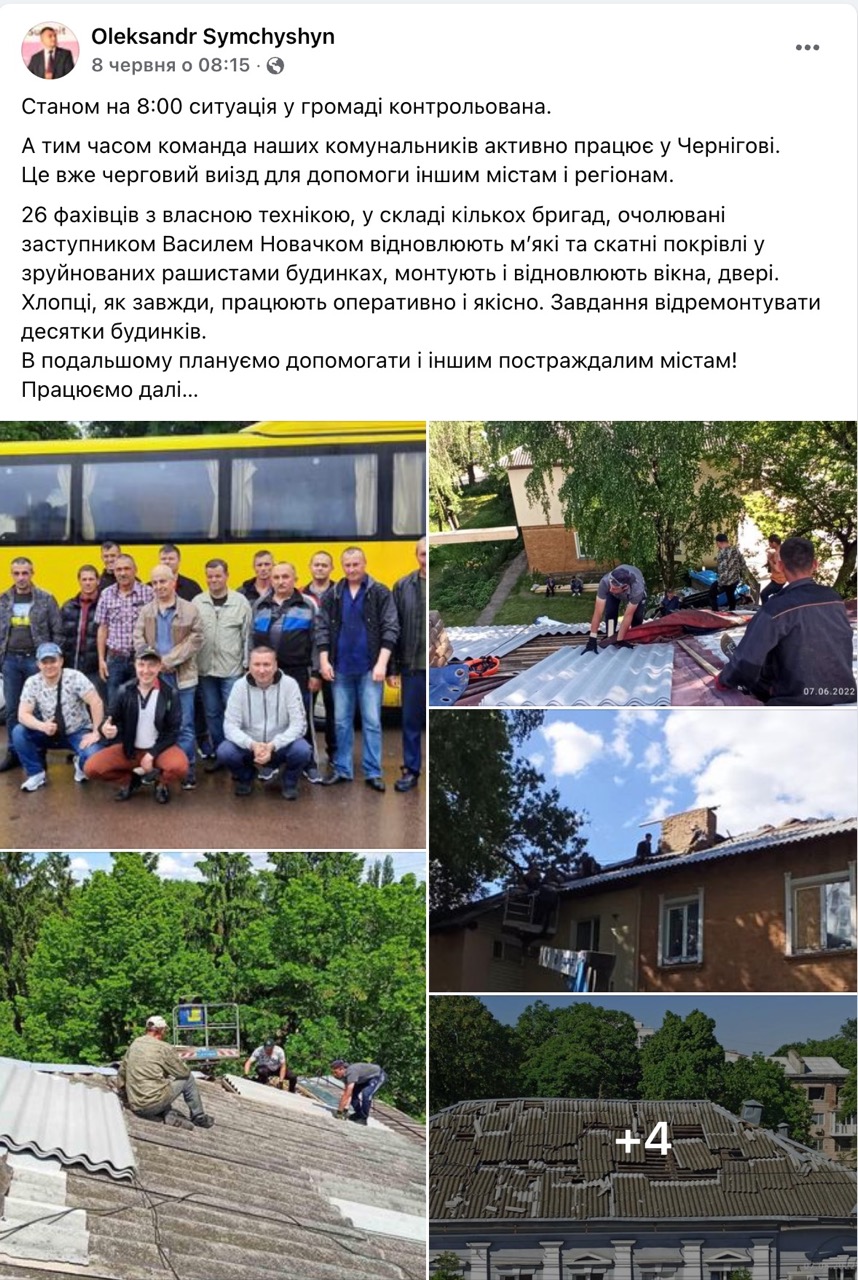 «26 фахівців з власною технікою, у складі кількох бригад, очолювані заступником Василем Новачком відновлюють м’які та скатні покрівлі у зруйнованих рашистами будинках, монтують і відновлюють вікна, двері», – повідомляли в телеграм-каналі міської ради.