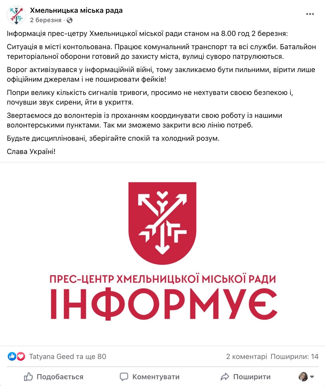 З перших днів повномасштабного вторгнення на сторінках Хмельницької міської ради в соцмережах, на каналі у телеграмі почали оперативно інформували про ситуацію в країні та громаді зокрема. Розміщували інформацію про те, де в разі надзвичайної ситуації облаштують пункти роздачі питної води, публікували посилання на карту укриттів, надавали перелік офіційних джерел інформації, повідомляли про сигнали тривоги, закликали долучатися до благодійних зборів для потреб військових тощо. Власне, цю функцію офіційні канали міськради продовжують виконувати дотепер.
