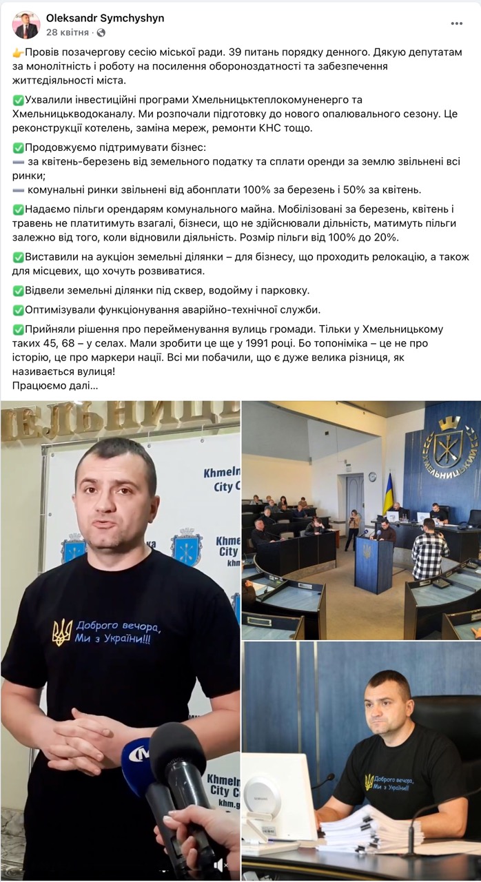 У шістнадцятій позачерговій сесії Хмельницької міської ради 28 квітня взяли участь 38 депутатів. В оприлюдненому на сайті ради порядку денному зазначили 39 питань. З-поміж основних рішень, які практично одноголосно ухвалили місцеві обранці, – пільги для місцевого бізнесу, аукціон земельних ділянок для релокованих та місцевих підприємств, а також перейменування вулиць громади – 45 у місті Хмельницькому та 68 у селах громади.