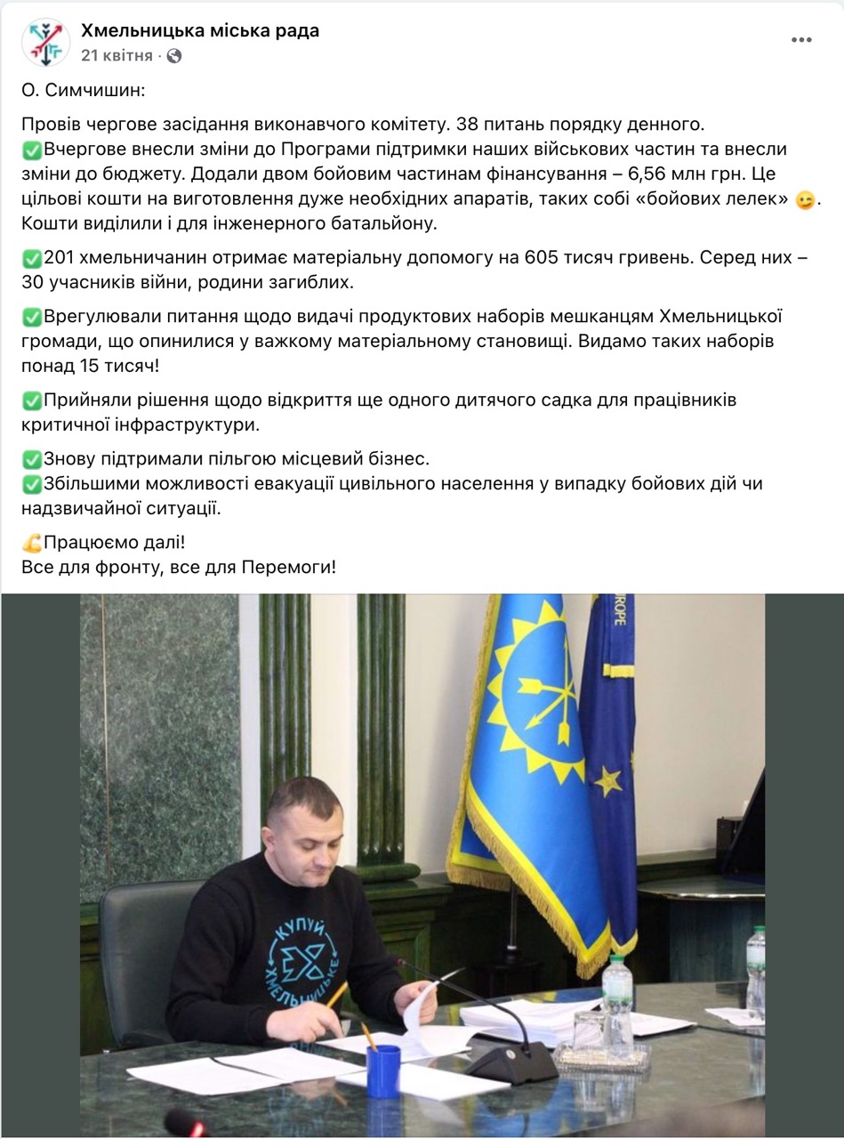 Виконавчий комітет Хмельницької міської ради, як свідчить інформація на сайті, від початку повномасштабної агресії росії проти України збирався на засідання шість разів. З-поміж рішень, які приймали в результаті засідань, такі, що стосувалися підтримки військових (виділяли фінансування військовим частинам, зокрема на придбання техніки, одягу та взуття, на ремонт автомобілів та оновлення матеріально-технічної бази); матеріальної допомоги хмельничанам, серед яких учасники війни та родини загиблих; щодо видачі продуктових наборів мешканцям громади, які опинилися в скруті; пільг місцевому бізнесу, та інші.