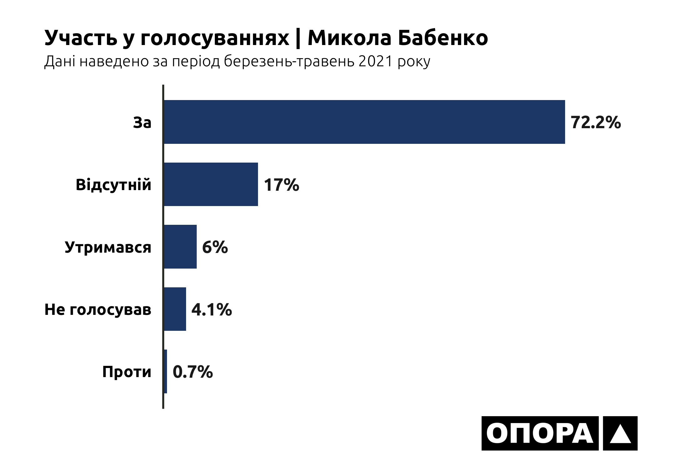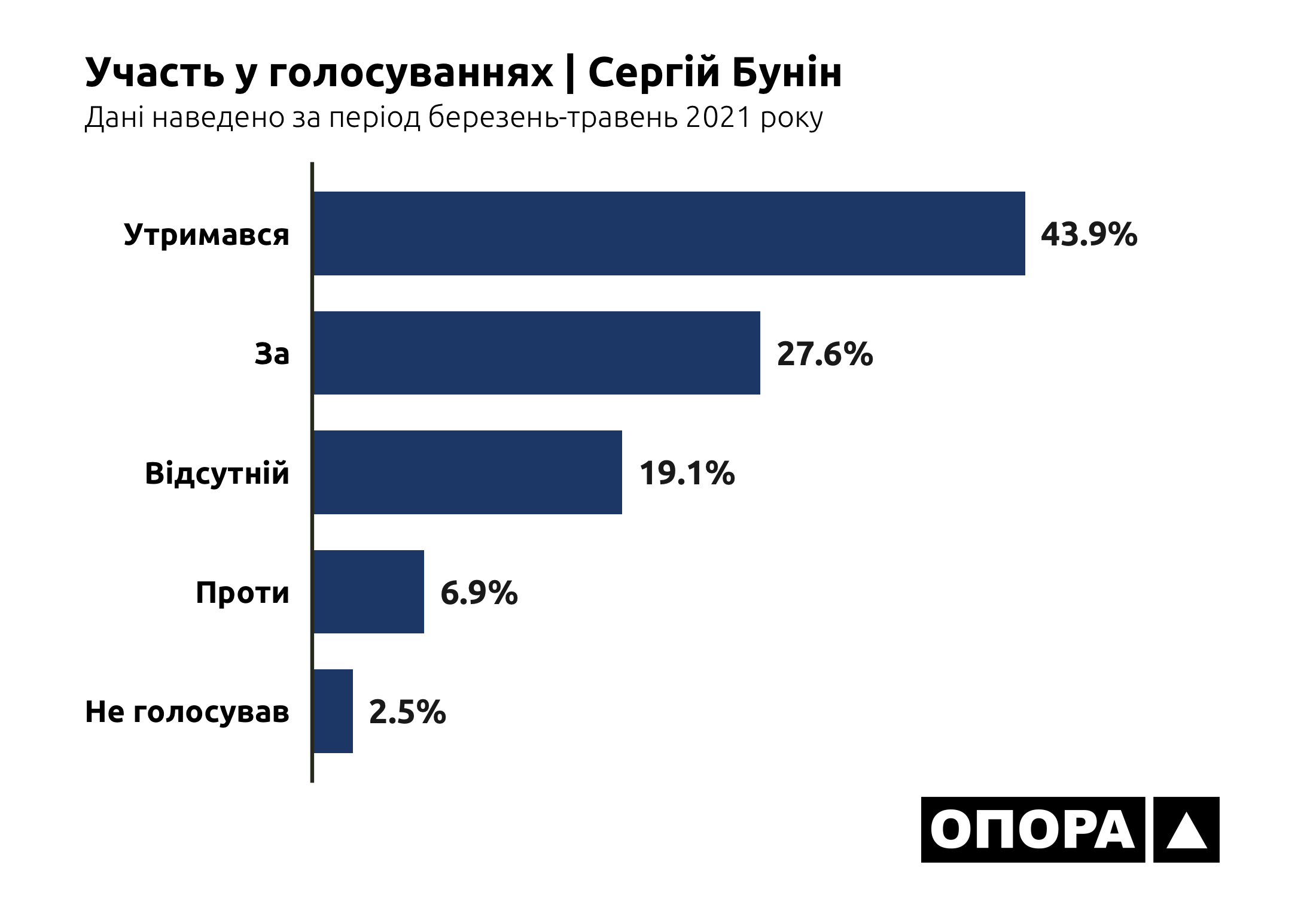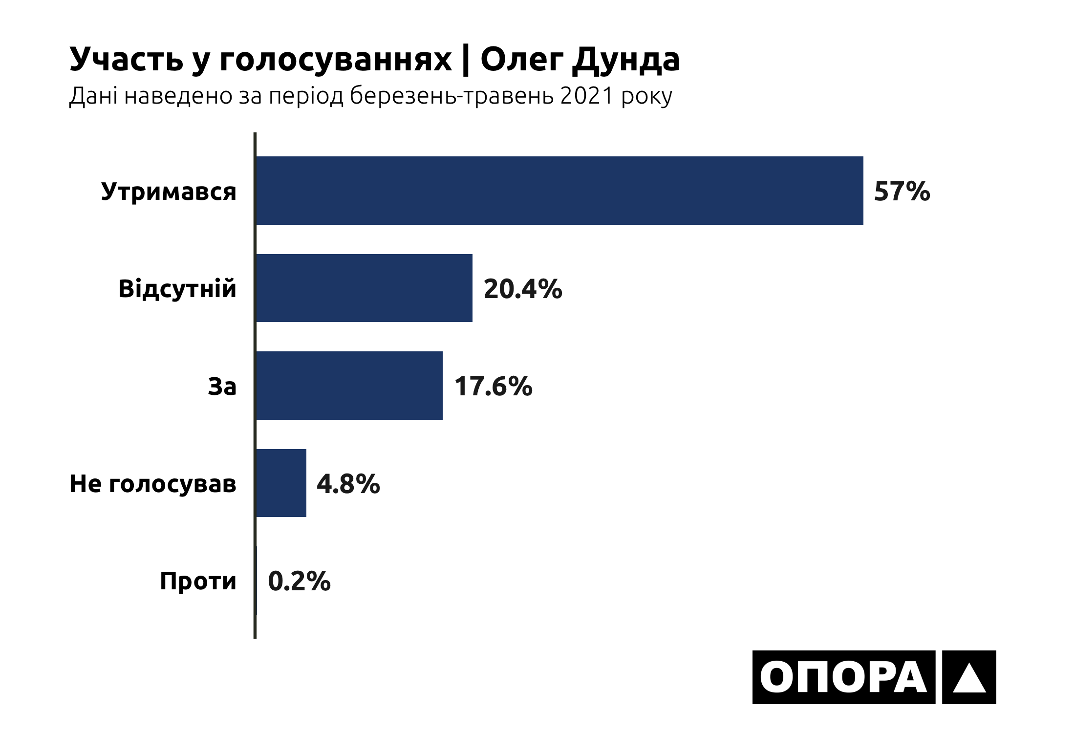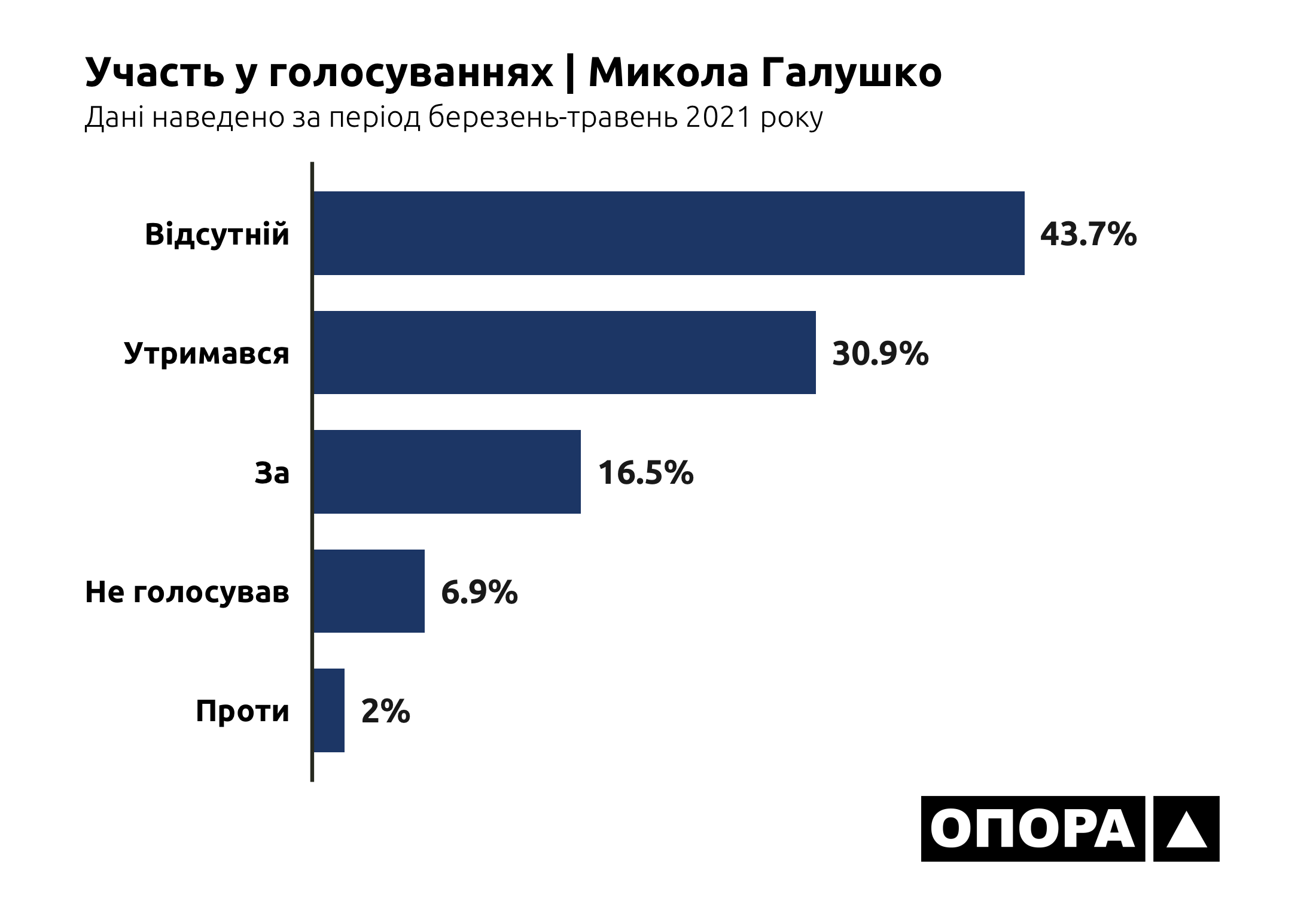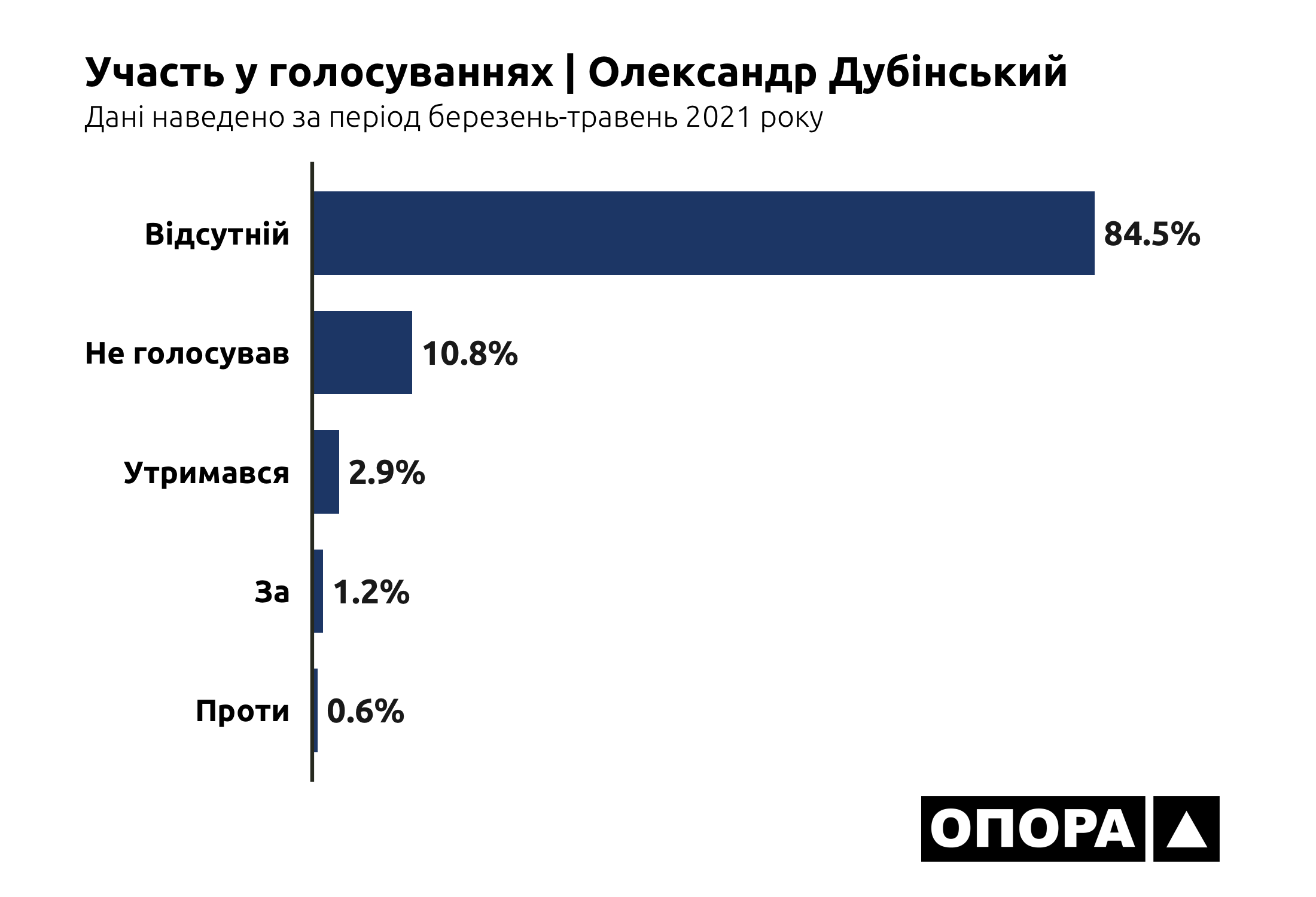 Лідером за кількістю пропущених засідань ВРУ навесні 2021 року є Олександр Дубінський. Так, народний депутат був «Відсутній» під час 1503 голосувань, що становить 84,5% від загальної кількості. На другому місці за кількістю пропусків є Микола Галушко, котрий пропустив 777 голосувань тобто 43,7%. На третьому Анна Скороход, в якої показник пропущених засідань становить 557 випадків або ж 31,3%. Ольга Василевська-Смаглюк пропустила 408 голосувань тобто 22,9%. Олег Дунда – 363, що становить 20,4%. Сергій Бунін 339 або 19,1%. Микола Бабенко 302 або ж 17%. Олександр Горобець 156, що становить 8,8%. Найменше пропусків має Валерій Колюх, котрий був «Відсутній» в 69 випадках, що становить 3,9%.