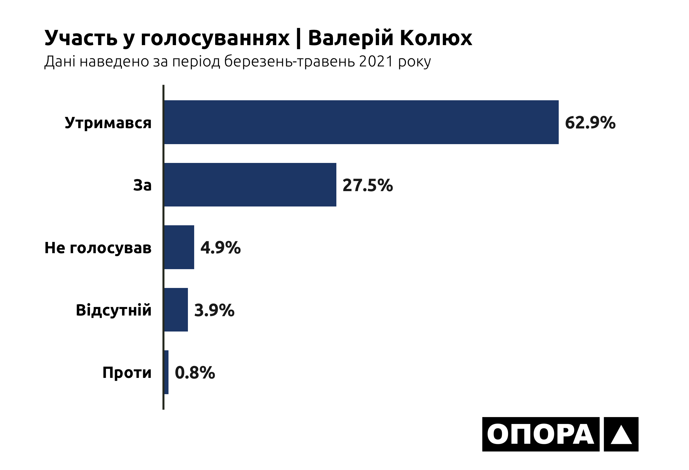 Протягом весни 2021 року в стінах ВРУ відбулось 1778 голосувань. Загалом 9 мажоритарників Київщини голосували «За» 4890 разів. Дану опцію серед всіх можливих парламентарі використовували найчастіше, що у відсотковому співвідношенні становить близько 30,5%. На другому місці серед депутатів є голосування кнопкою «Утримався», дану опцію представники Київщини обирали 4825 разів, що становить 30,1%. Найменше депутати голосували «Проти» – 860 разів, тобто 5,4%. Показники «Відсутній» та «Не голосував» сукупно у мажоритарників Київщини становлять – 4474 рази та 953 рази, або 28% та 6%.