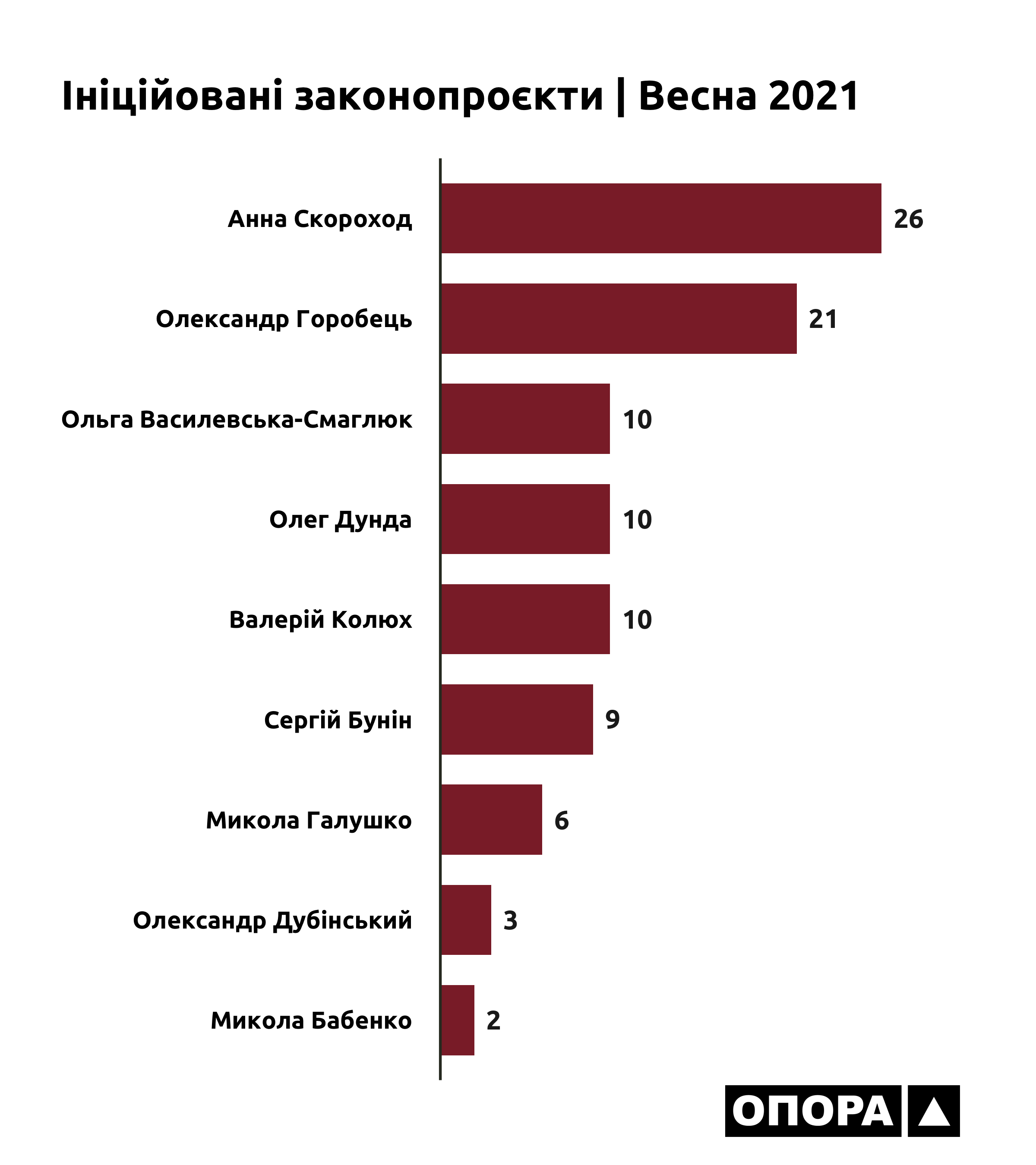 Протягом весни 2021 року всі 9 мажоритарників Київщини виступали ініціаторами (авторами чи співавторами) законопроєктів і таким чином долучились до створення 72 законодавчих ініціатив. Лідерами за кількістю ініційований законопроєктів є Анна Скороход котра має 26 зареєстрованих ініціатив та Олександр Горобець – 21. По 10 ініціатив законопроєктів є в Ольги Василевської-Смаглюк, Олега Дунди та Валерія Колюха. Сергій Бунін має 9 ініціатив, Микола Галушко – 6, Олександр Дубінський – 3 та Микола Бабенко – 2.