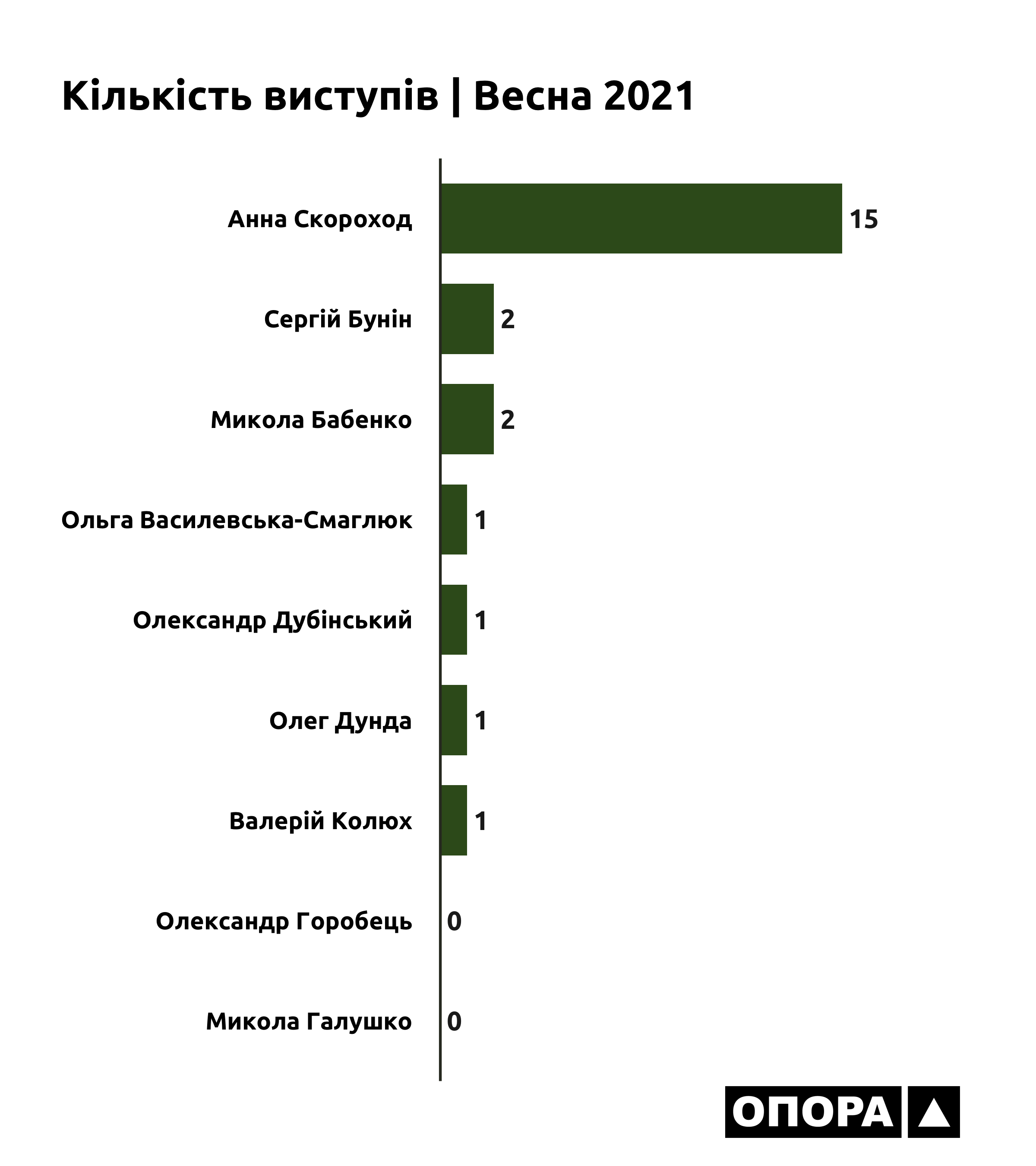 7 з 9 депутатів-мажоритарників Київської області, протягом весни 2021 року мали 23 виступи у Верховній Раді, загальна тривалість яких становить 33 хвилини 17 секунд. Лідером як за тривалістю так і за кількістю виступів є обраниця 93 виборчого округу Анна Скороход. Загалом парламентарка виступала 15 разів, що зайняло 25 хвилин 35 секунд. По 2 виступи мали Микола Бабенко – 2 хвилини 34 секунди та Сергій Бунін – 1 хвилина 14 секунд. По 1 виступу в Олександра Дубінського – 2 хвилини 4 секунди, Валерія Колюха – 1 хвилина 1 секунда, Олега Дунди – 54 секунди та Ольги Василевської-Смаглюк – 30 секунд. Олександр Горобець та Микола Галушко не мали виступів у ВРУ в період з 1 березня по 31 травня 2021 року.