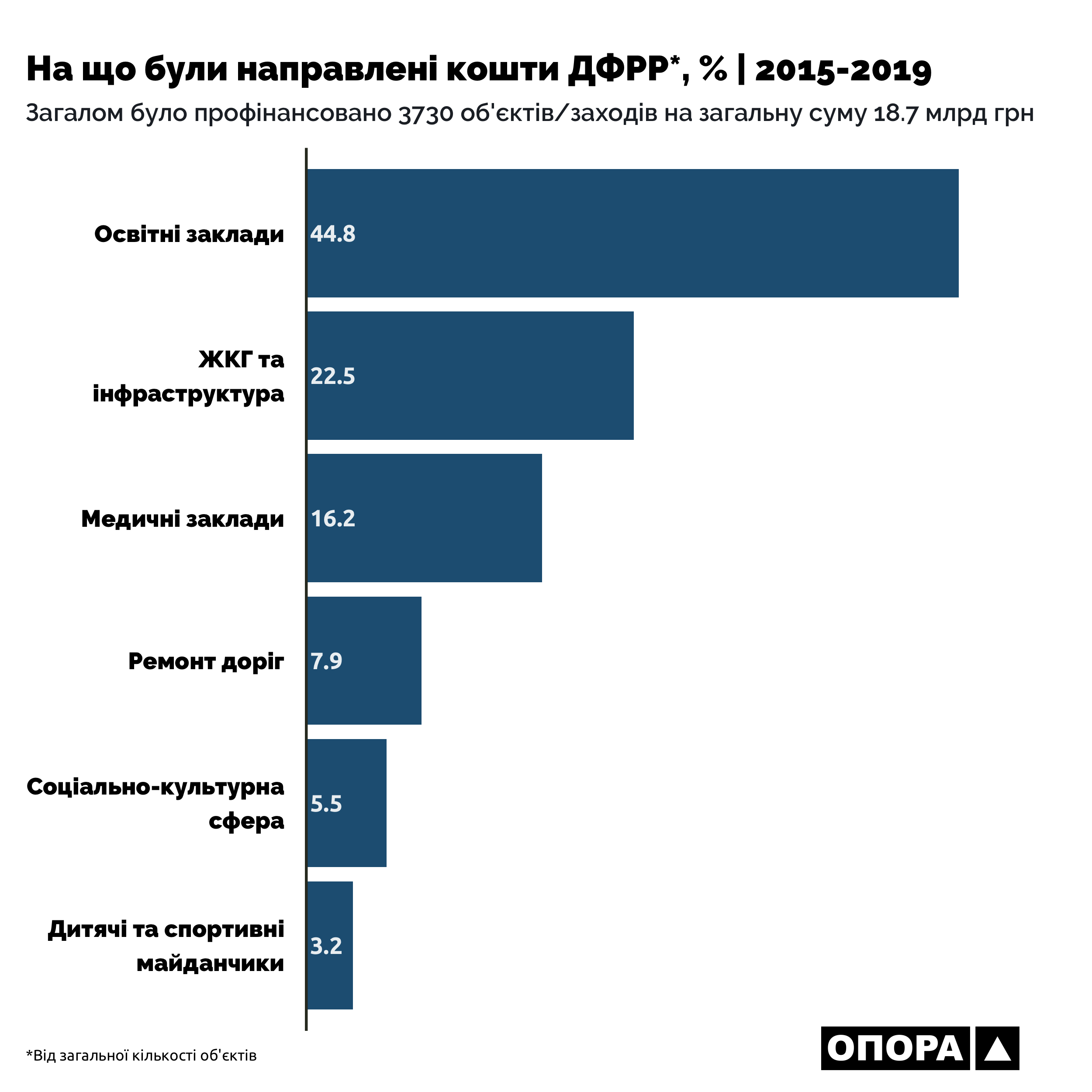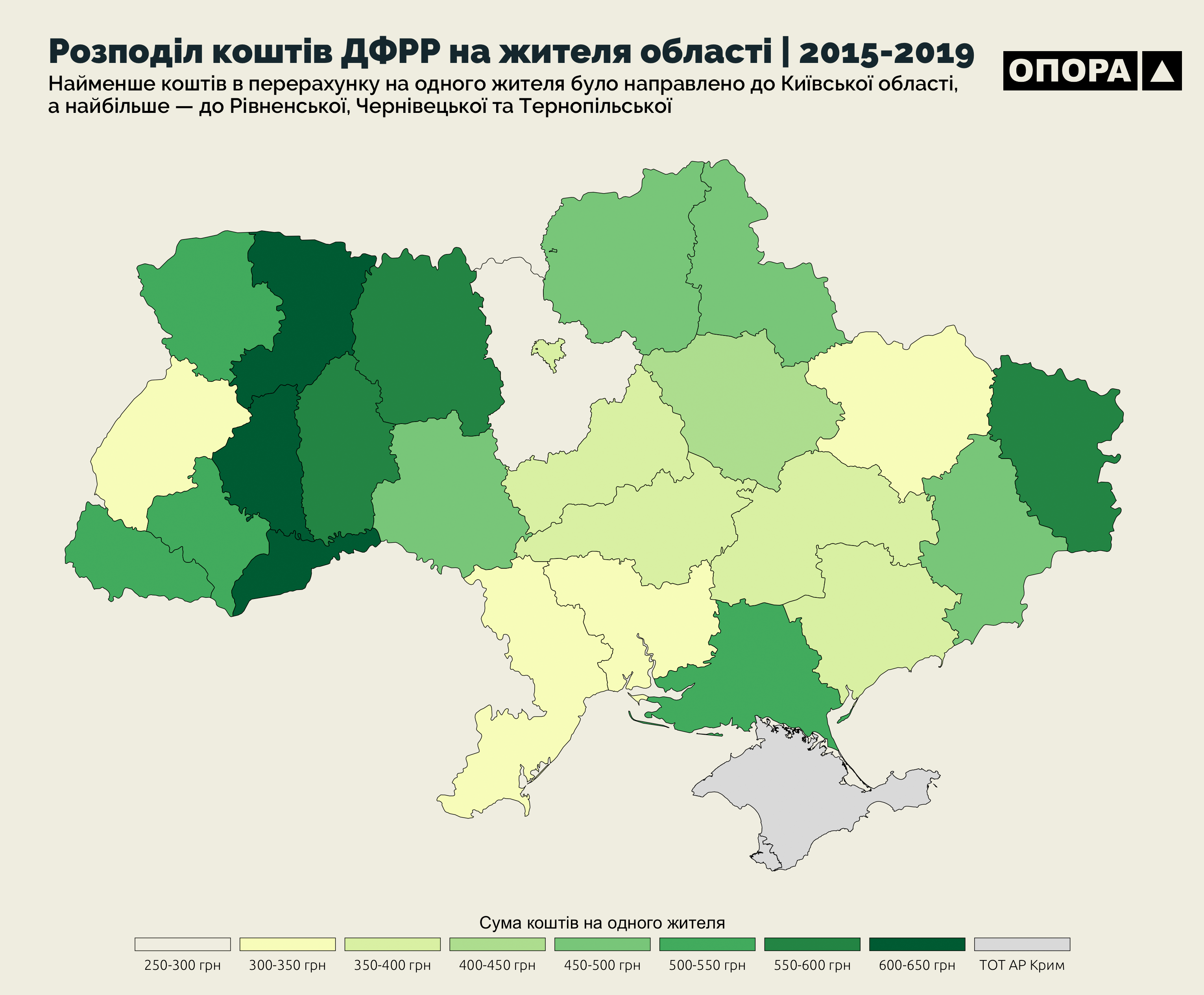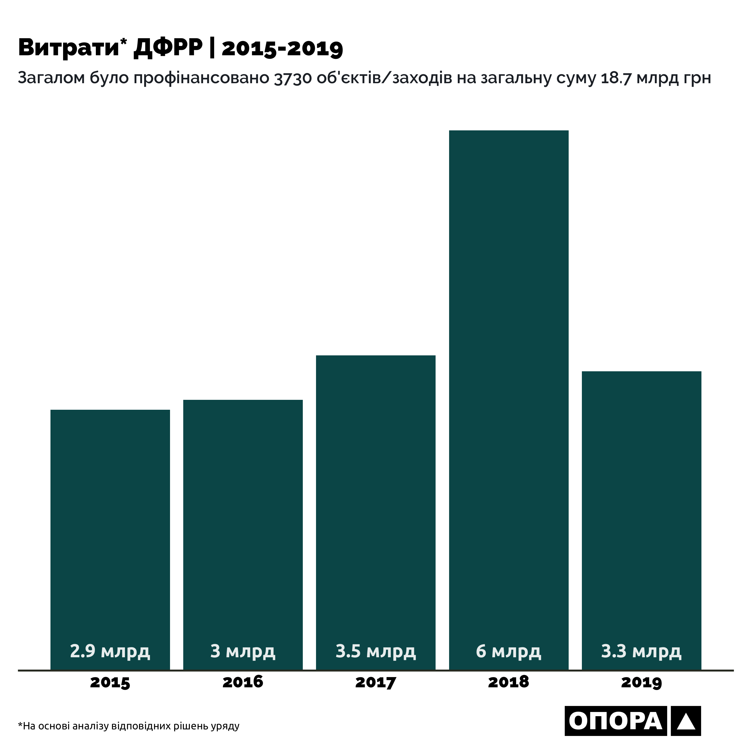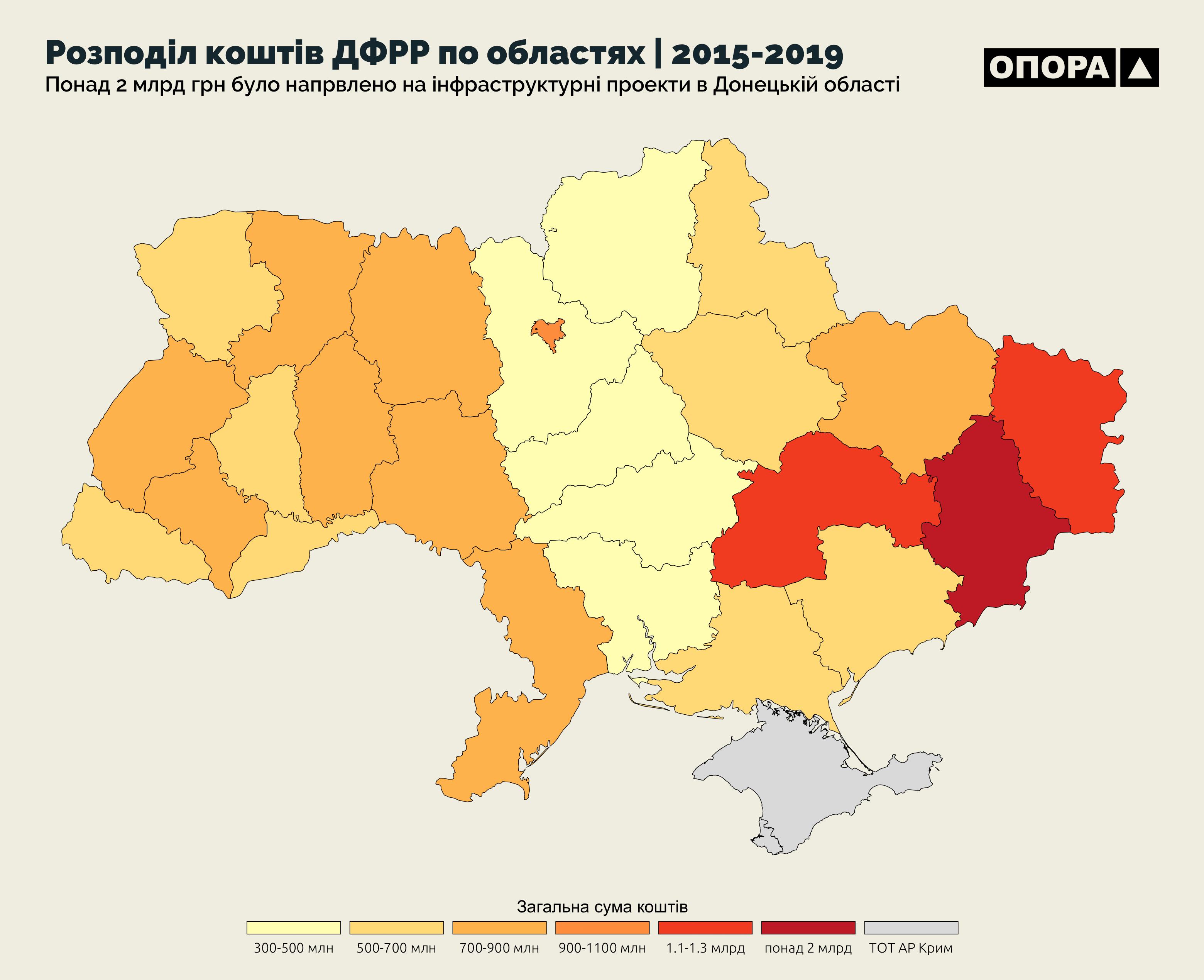 Загалом за 2015 – 2019 роки було проаналізовано 3 730 об‘єктів загальною вартістю понад 18 млрд 689 млн грн. Не вдалося встановити місцезнаходження в межах округу для 156 об’єктів/заходів. За цей період найбільше коштів ДФРР було спрямовано у Донецьку, Луганську, Дніпропетровську області та у місто Київ. У Донецьку область було направлено 2 млрд 33 млн гривень, у Луганську – 1 млрд 242 млн гривень, у Дніпропетровську – 1 млрд 178 млн гривень, у м. Київ – 1 млрд 29 млн гривень. Найбільше об'єктів було профінансовано у Донецькій (313), Закарпатській (302), Луганській (268) та Львівській (263) областях.