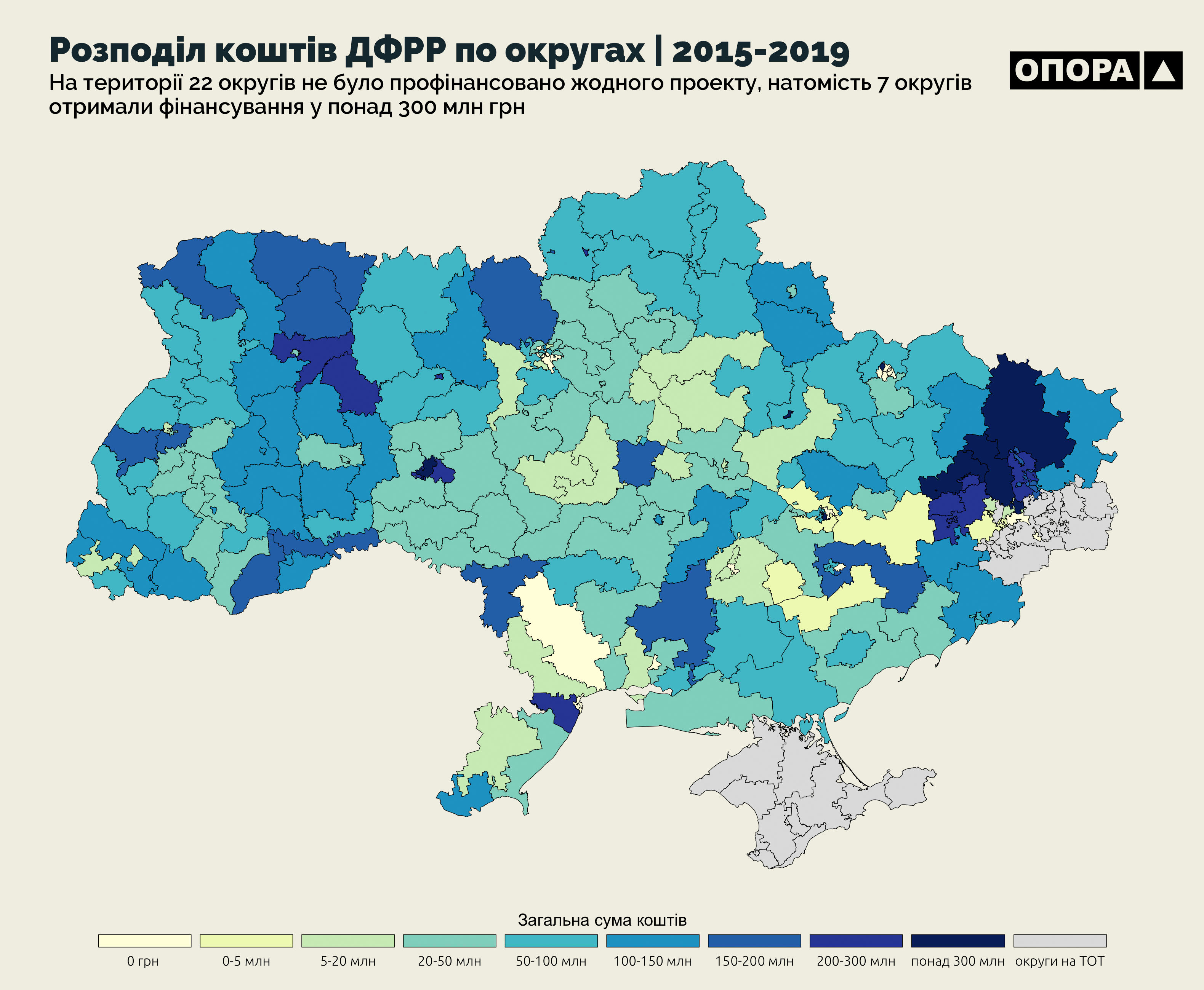 Якщо говорити про розподіл коштів у межах одномандатних округів, то з ДФРР дещо схожа ситуація, як із субвенцією на соціально-економічний розвиток окремих територій. Проте у випадку розташування округів на території великих міст (Київ, Одеса, Харків, Дніпро), варто звернути увагу на той факт, що значна частина коштів була направлена на проєкти загальноміського значення і точну прив’язку об’єкта/заходу до певного округу неможливо встановити.