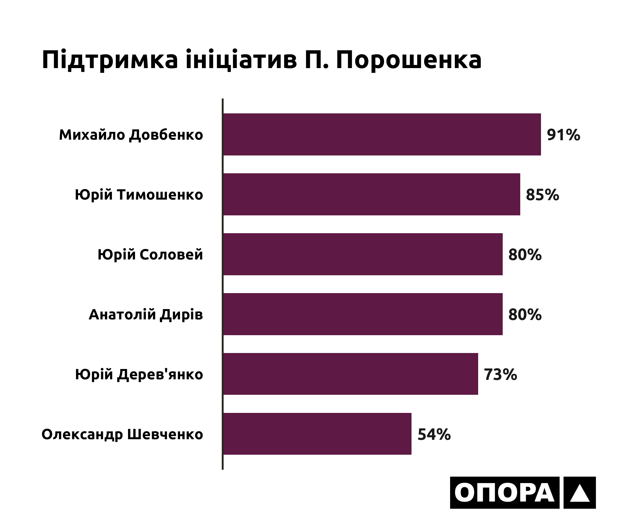 Під час перших двох років президенства Петра Порошенка найпослідовнішим прихильником політики екс-президента серед екс-депутатів обраних у одномандатних округів Івано-Франківщини був Михайло Довбенко (84 округ, фракція «БПП «Солідарність»), який під час 91% голосувань підтримував законотворчі ініціативи Петра Порошенка. У Юрія Тимошенка (88 округ, фракція Народний Фронт) цей показник становив 85%, у Юрія Солов’я (89 округ, фракція «БПП «Солідарність») та Анатолія Диріва (86 округ, фракція Народний Фронт) показник підтримки був на рівні 80%. Позафракційний Юрій Дерев’янко (87 округ) протягом перших двох років президенства Порошенка під час 73% голосувань за його законотворчі ініціативи голосував позитивно, тобто «за». Найменш лояльним до законопроєктів Петра Порошенка у вищезазначений період був позафракційний Олександр Шевченко (83 округ), проте під час більше половини голосувань він таки підтримував політику попереднього президента, його показник такої підтримки становив 54%.