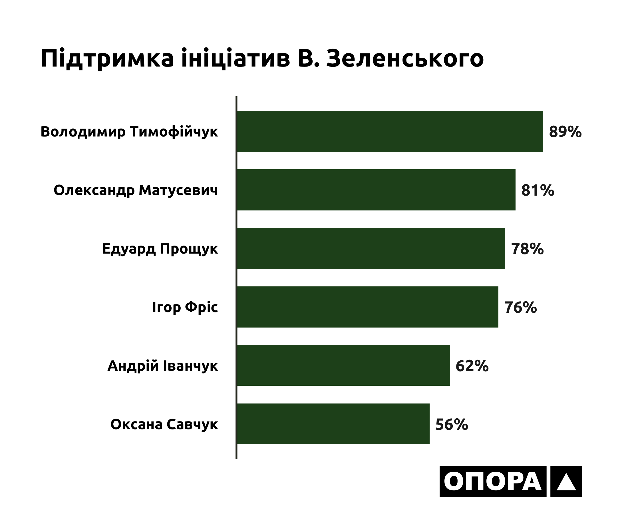 Найбільш лояльними до президентських законотворчих ініціатив є місцеві мажоритарники «Слуги народу», які жодного разу голосували проти законотворчих ініціатив Володимира Зеленського, проте під час голосувань іноді користуються опцією «утримався». Проєкт закону «Про внесення змін до Закону України «Про судоустрій і статус суддів» та деяких законів України щодо діяльності Верховного Суду та органів суддівського врядування» не знайшов підтримки Олександра Матусевича та Едуарда Прощука, які утримались під час голосування. Аналогічна позиція у Едуарда Прощука та Ігоря Фріса була продемонстрована під час голосування за президентський законопроєкт «Про внесення зміни до статті 364 Кримінального кодексу України щодо уточнення ознак окремих злочинів у сфері службової діяльності». Володимир Тимофійчук, Олександр Матусевич, Ігор Фріс і Едуард Прощук 1 грудня 2020 року утримались при голосуванні за законопроєкт «Про державну підтримку інвестиційних проєктів зі значними інвестиціями», але вже 17 грудня того ж року згадані парламентарі проголосували за цю законотворчу ініціативу Президента.