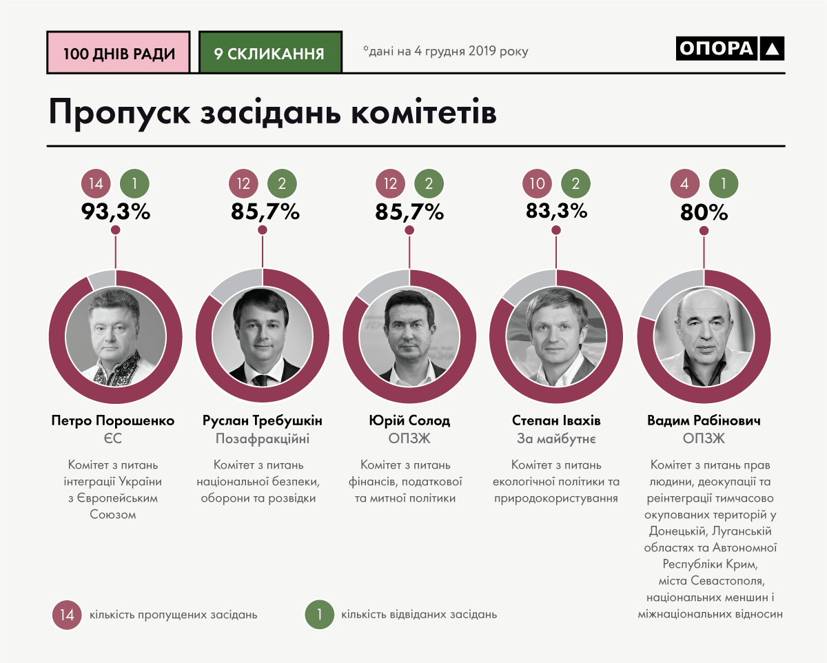 Так, Віталій Данілов (“Батьківщина”) був відсутнім на 71,3% засідань парламенту, Сергій Тарута (“Батьківщина”) — 68,5%, Вадим Рабінович (“Опозиційна платформа — За життя”) — 66,1%.